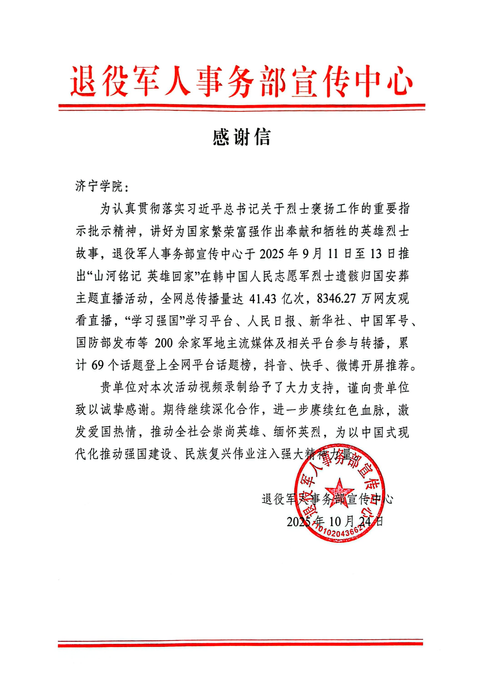 近日,退役军人事务部宣传中心向我校发来感谢信,对我校在参加“山河铭记 英雄回家”在韩中国人民志愿军烈士遗骸归国安葬主题...