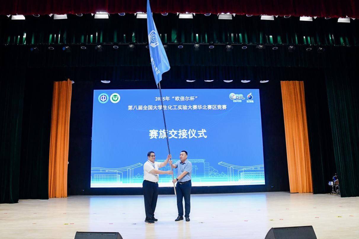 闭幕式上,进行了赛旗交接仪式,化学化工与材料学院院长刘涛交旗,下一届主办方山东理工大学化学化工学院院长杨乃涛接旗。