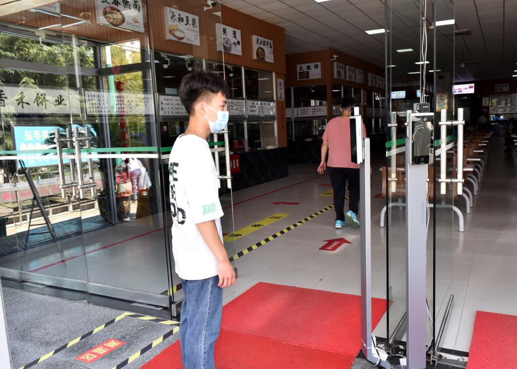 入校时,使用企业微信扫码报到,出示绿色健康通行码、测量体温、行李消杀后才能进校。