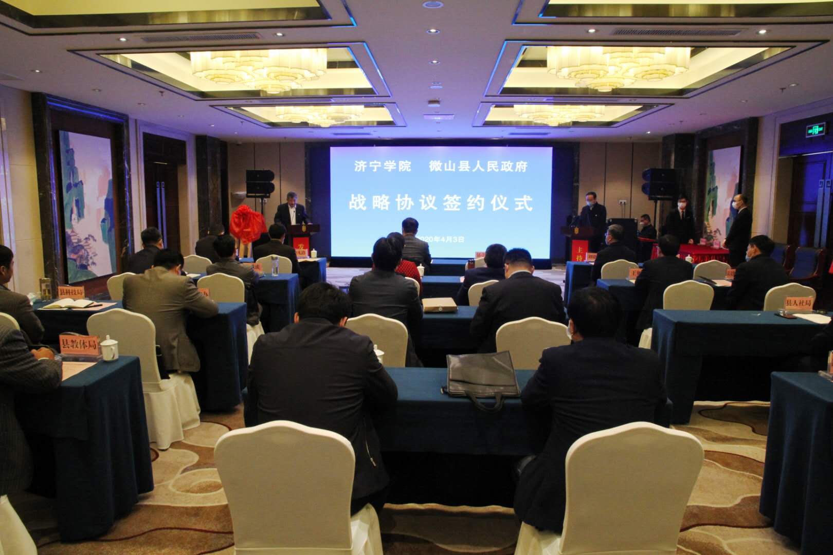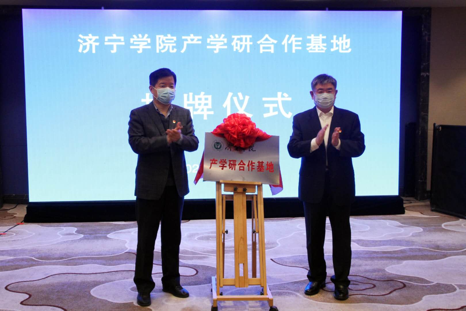 郁章玉、张茂如共同出席了我校与微山县战略合作框架协议签署暨产学研基地揭牌仪式,并为产学研合作基地揭牌。刘德胜代表学校与微山县人民政府签署战略合作框架协议,赵洁代表学校与微山县爱尚湖旅游发展有限公司签订产学研基地合作协议。