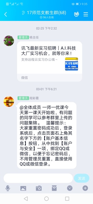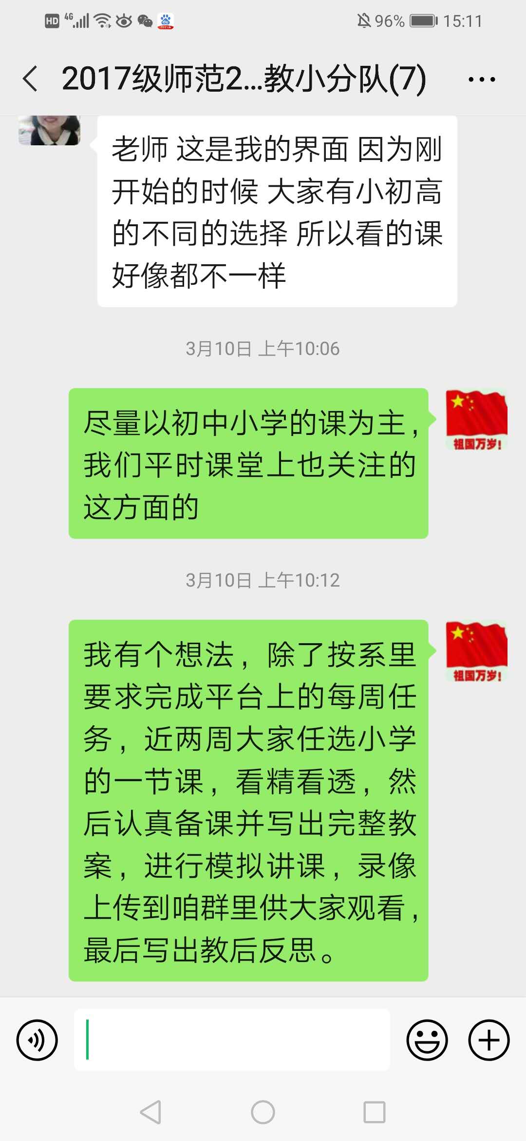 全体指导老师认真落实线上学习相关文件要求,严格执行线上实习方案,利用“校友邦”实习软件的签到、周记批改等功能,督促学生每天按时签到,上传周记、学习心得,定期完成实习教案。师范实习生在山东教师教育网“一师一优课”平台和指导老师推荐的其它实习资源网站进行在线观评课等实践活动。师生共用腾讯会议、腾讯课堂、“一师一优课工作坊”、qq群和微信群等网络平台进行在线实习指导交流。
