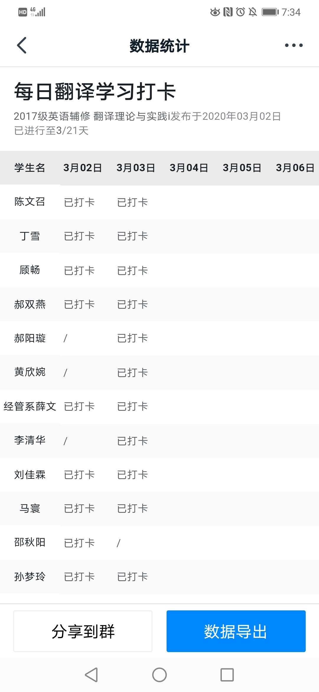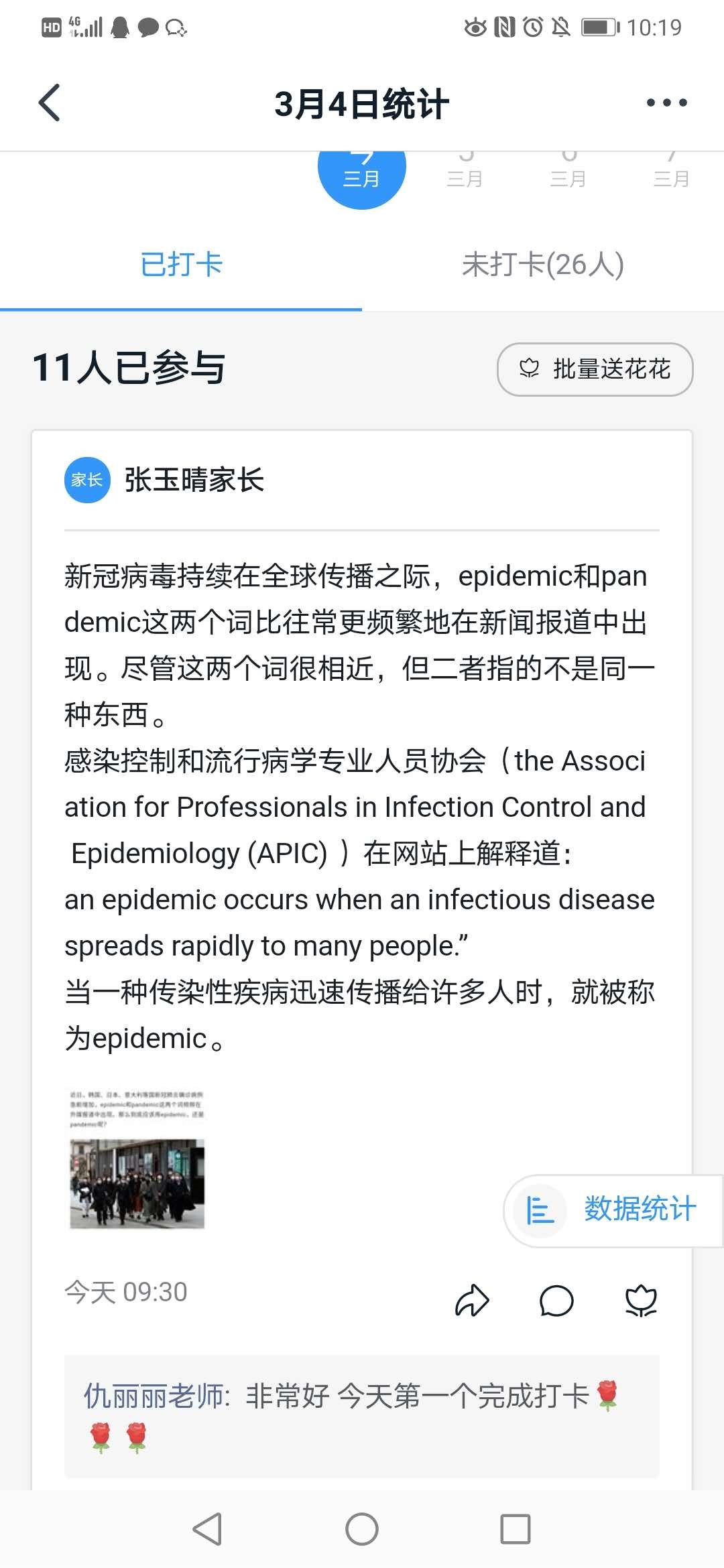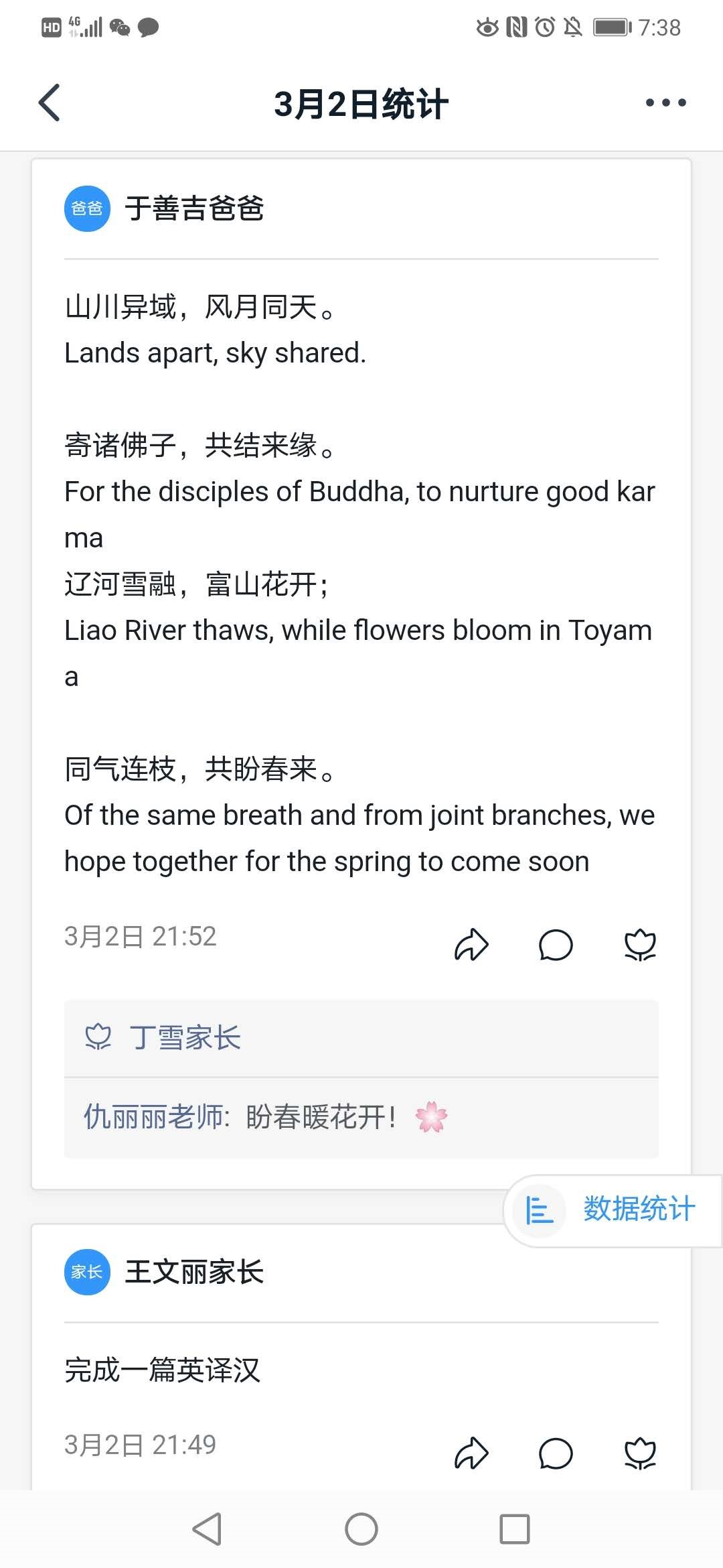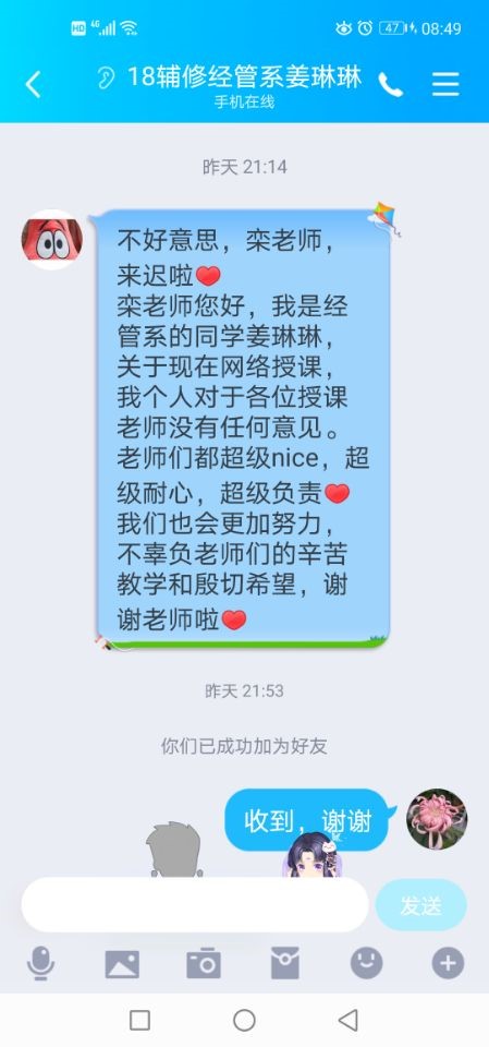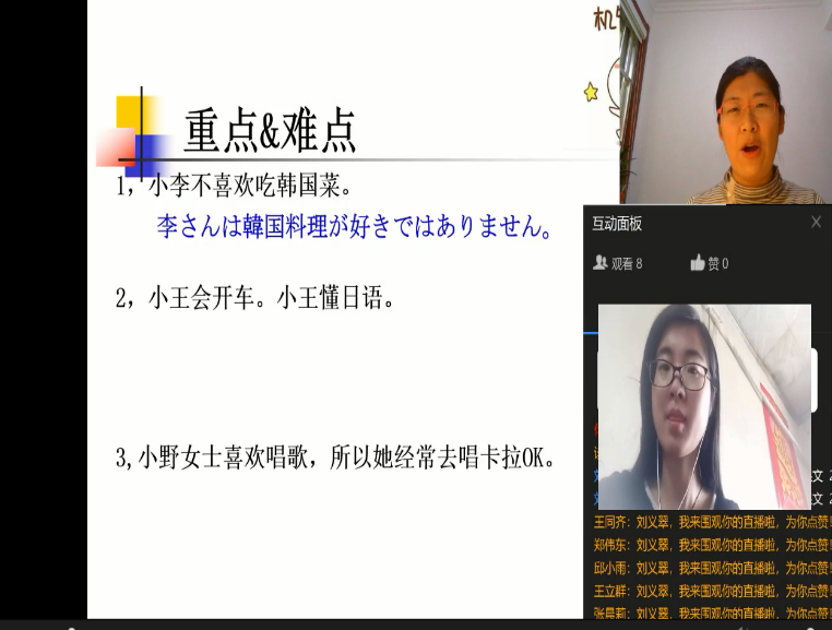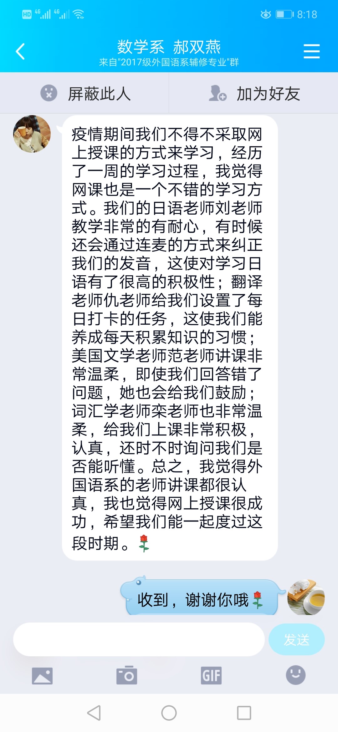 老师们在线上教学中也注重关心学生,调整改进教学方法。为保证学生的学习效果,二外日语刘义翠老师调整课间休息时间,叮嘱学生注意舒展筋骨,做眼保健操,多喝水。学生们感觉老师的直播课就像是私人家教,老师的细心讲答和充足的课堂互动让学生们受益匪浅。闫彩霞老师的“123一起翻”是《汉英笔译》课程讨论群的名字,也是师生在这段特殊时期携手共渡难关的写照。