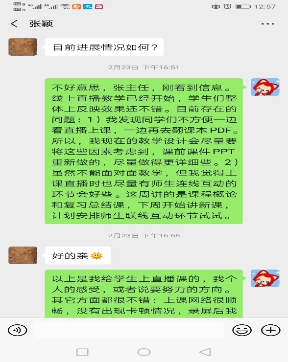 在线直播教学的技术要求进一步激发了老师们超越自我、攻坚克难的职业精神,别样的在线课堂燃起了学生们的学习热情,互联网技术手段使师生重聚。老师们借助智慧树、学堂在线雨课堂、腾讯课堂、腾讯会议、钉钉直播、微信或QQ群等在线教学工具或平台进行网络授课,同时也做好了学习、考勤、课间休息安排,利用平台提供的在线互动、测试等工具,提高课堂的活跃度,在微信群和QQ群做好课下辅导、研讨、答疑等工作。学生们学习适应新模式,锻炼了自主学习能力,提高了自我管理和督促能力,灵活的课堂互动让师生之间的关系更加亲密,感情更加深厚。