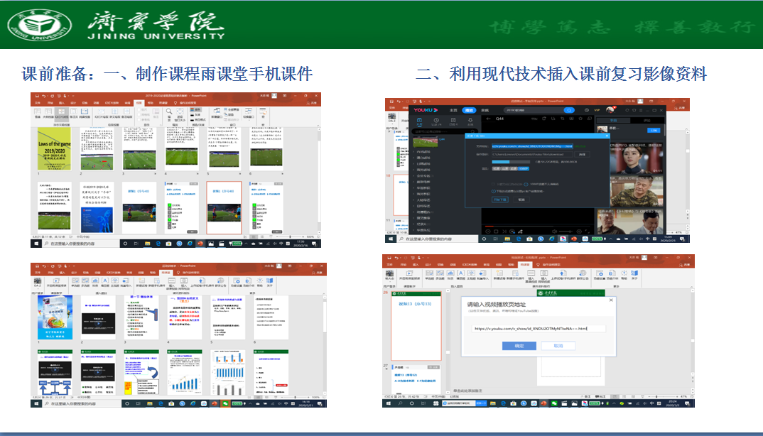 体育系任课教师克服困难,积极响应,充分利用慕课、雨课堂、泛雅、智慧树、山东省高等学校在线开放课程联盟等在线平台;通过腾讯课堂、钉钉、腾讯会议等线上直播工具,结合本人所代课程特点,分别开展雨课堂+腾讯会议室、zoom会议室+微信班级群、“线上+直播答疑”混合式教学、“直播教学”、“在线讨论”、“QQ或微信建群”等灵活多样的授课模式。截止目前为止,已有37位老师采用多种线上平台、模式进行教学。线上教学过程中,教师准备充分,态度认真,严格要求;学生积极互动,线上课程受到普遍好评。