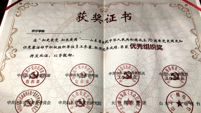 近日,我校在“知史爱党、知史爱国”——山东省庆祝中华人民共和国成立70周年“党史国史知识竞赛”中获优秀组织奖。此次活动由省委组织部、省委宣传部、省委教育工委等主办。