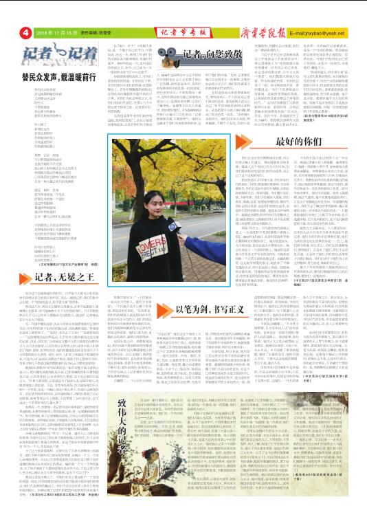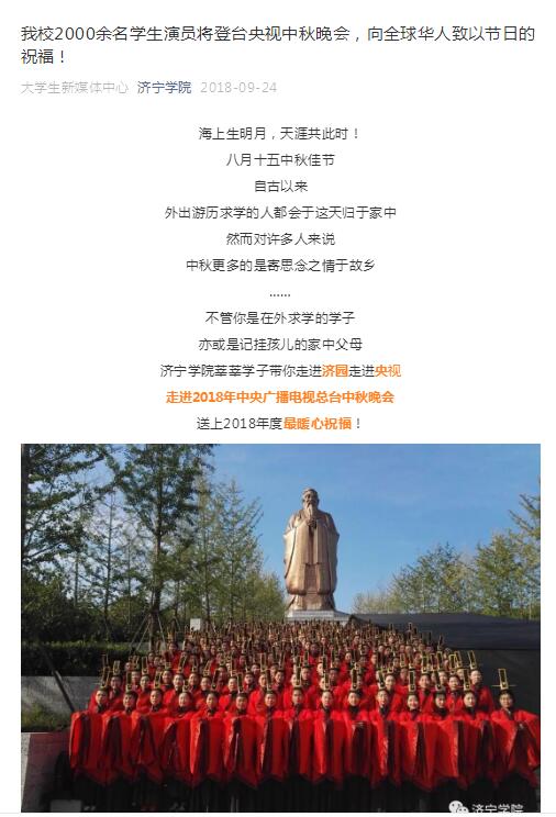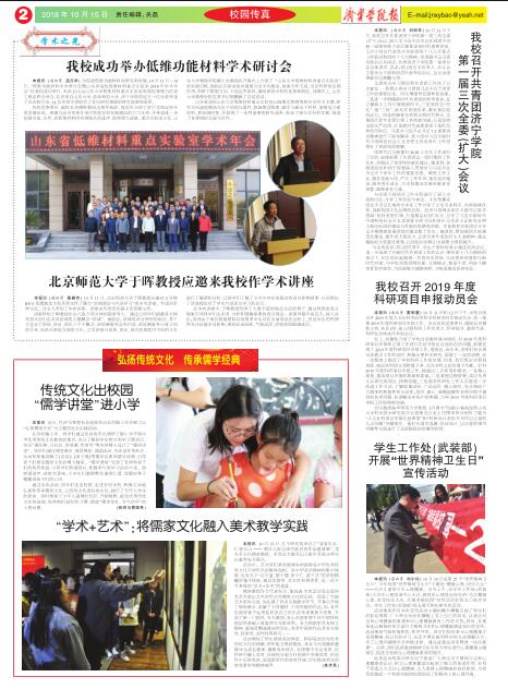 近日,由中国高校校报协会组织的“2018年度中国高校校报好新闻”评选结果揭晓,我校校报共选出六件作品参评,三件作品获奖:《我校2000余名学生演员将登台央视中秋晚会,向全球华人致以节日的祝福》(王平、曹莹)获新媒体类二等奖;《传统文化出校园 “儒学学堂”进小学》(袁芬)获新闻摄影类三等奖;2018年11月15日第14期第04版《记者节专版》(杨霞、盛楠楠、王莹)获版面类三等奖。