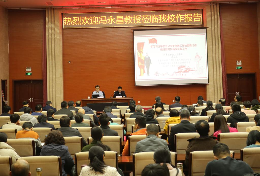为深入学习贯彻习近平总书记关于宗教工作重要讲话精神,加强师生对党的宗教政策、形势与热点问题的了解和认识,帮助师生正确看待宗教信仰问题,树立正确的宗教观念,12月12日下午,学校邀请山东省社会主义学院中华文化教研部副主任冯永昌教授在科技楼学术报告厅作了题为《学习习近平总书记关于宗教工作的重要论述,做好新时代宗教工作》的专题报告会。报告会由党委副书记马恩主持。学校领导班子成员、党委理论学习中心组成员、处级干部、各党支部书记、团总支书记、辅导员和马院教师、学生干部代表等200余人参加了报告会。这也是我校2019年明德讲堂第三场报告会。
