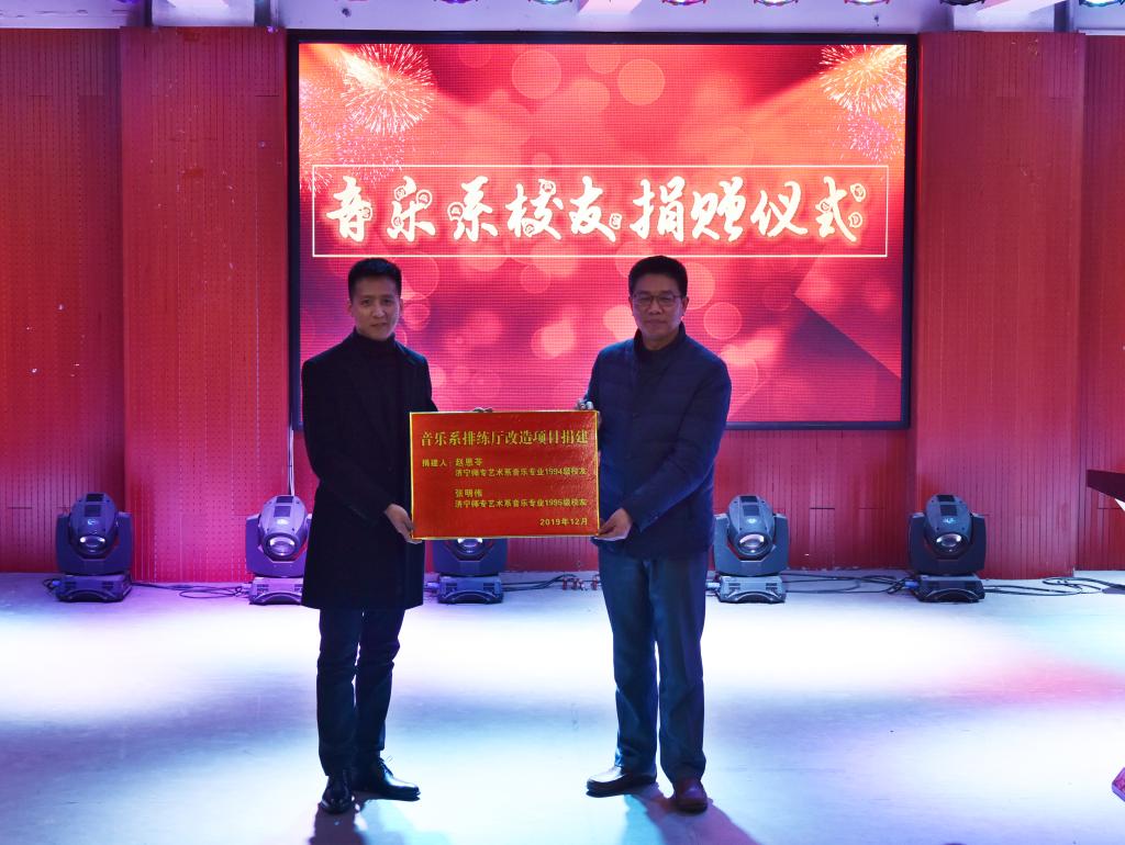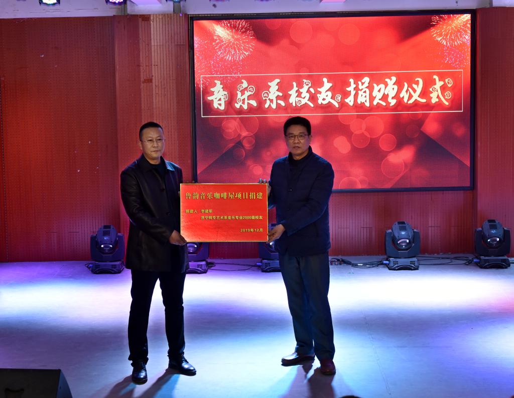 音乐系1994级校友、嘉祥爱乐艺术中心创办人赵恩苓,音乐系2000级校友、曲阜鲁韵学校校长李建军分别捐建“音乐系排练厅改造项目”、“鲁韵音乐咖啡屋”。校党委副书记马恩代表学校接受校友捐赠,并向两位校友颁发“捐赠证书”。