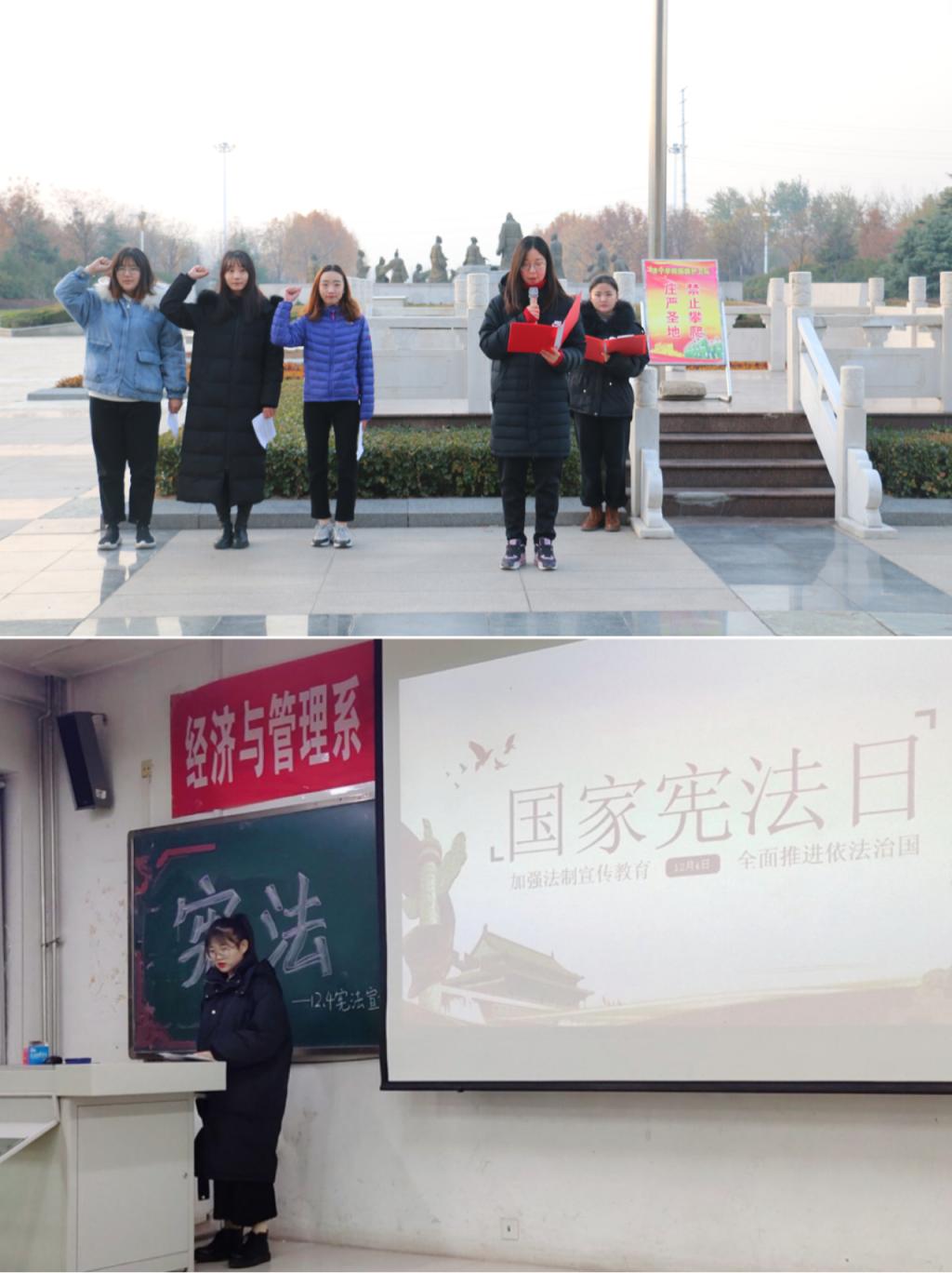 12月1日至7日是2019年“宪法宣传周”,本次宣传周活动主题为“弘扬宪法精神,推进国家治理体系和治理能力现代化”。12月2日清晨,我校近千余名教师和学生代表齐聚圣贤广场,参加宪法日升旗仪式,并进行了国旗下宣誓活动,号召全体师生积极践行宪法精神。12月4日晚,“弘扬宪法精神,礼赞我的祖国”微视频大赛在理科楼报告厅隆重举行,参赛作品紧扣宪法主题,立足践行社会主义核心价值观,培育学习宪法、尊崇宪法的校园法治文化。12月8日晚,法律咨询协会宣讲团走进经济与管理系(儒商学院)各团支部,开展了“宪法进校园”为主题的理论宣讲,进一步引导和促进广大青年学生学习宪法知识,弘扬社会主义法治精神。