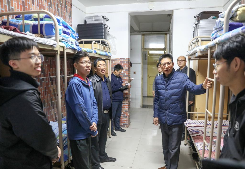 在学生公寓东区,马恩查看了学生公寓环境,听取了后勤处及学生公寓管理人员关于宿舍供暖、公寓设施、安全管理等方面的介绍,并深入学生宿舍与学生交流谈心,详细询问了同学们的学习、生活近况。他鼓励同学们发扬艰苦奋斗的精神,全身心投入到学习中,克服困难、努力奋进;征询了同学们对改进公寓服务的意见建议,嘱咐同学们安心学习,学校一定会满足同学们提出的合理化诉求,积极为同学们营造和谐温馨的学习、生活环境。