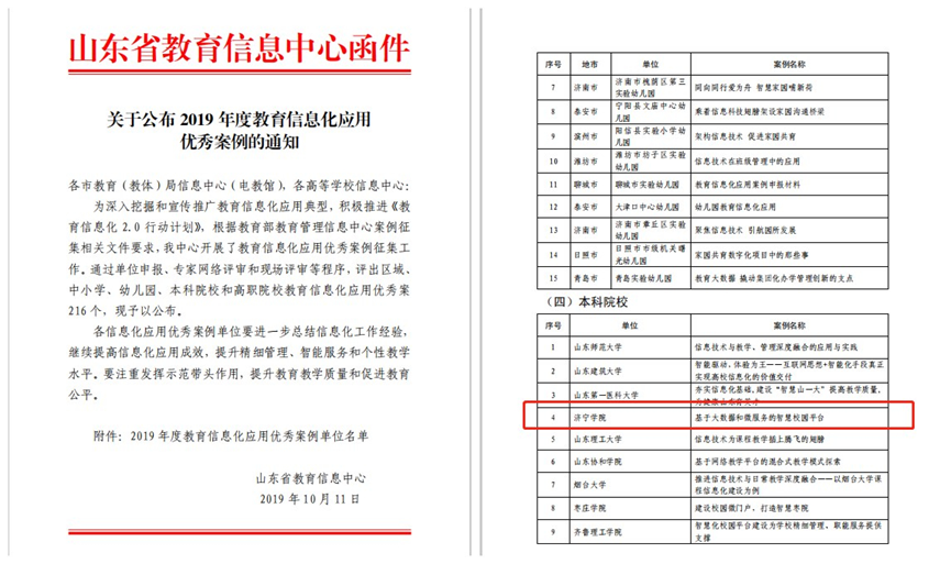 为深入挖掘和宣传推广教育信息化应用典型,积极推进《教育信息化2.0行动计划》,根据教育部教育管理信息中心案例征集相关文件要求,山东省教育信息中心开展了2019年度教育信息化应用优秀案例的征集工作。经过单位申报、专家网络评审和现场评审等程序,共评出本科院校优秀案例15例。我校组织申报的《基于大数据和微服务的智慧校园平台》获评为本科院校教育信息化应用优秀案例。