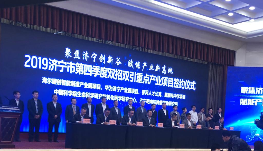 10月15日下午,2019济宁市第四季度双招双引重点产业项目签约仪式在圣都国际会议中心隆重举行。我校与济宁高新区管委会签署了“济宁靶向抗肿瘤药物研究院”共建合作协议,是本次签约单位的唯一一所驻济高校。校党委委员、副院长刘德胜应邀出席并代表学校签署协议,科研处、生命科学与工程系有关负责人参加活动。