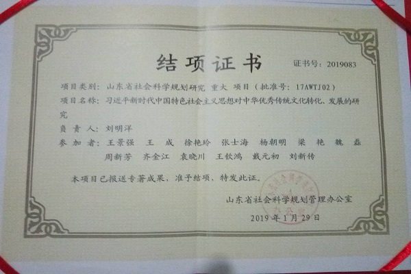 由中文系王钦鸿教授、王祥副教授参撰的山东省社科规划重大项目“习近平新时代中国特色社会主义思想对中华优秀传统文化转化、发展的研究”课题成果《转化与发展:走进新时代的中华优秀传统文化》已由山东人民出版社出版;5月12日,成果发布会在济南山东大学中心校区举行。该项目已于今年1月29日由省社科规划办批准结题(结项证书号:2019083)。这标志着历时两年的课题研究画上完美句号。