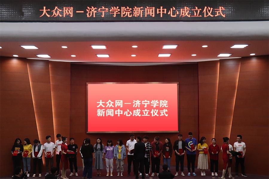 马恩与王振共同为大众网济宁学院新闻中心揭牌,刘钰与朱仙娉为大众网济宁学院新闻中心首批20名校园记者颁发聘书。