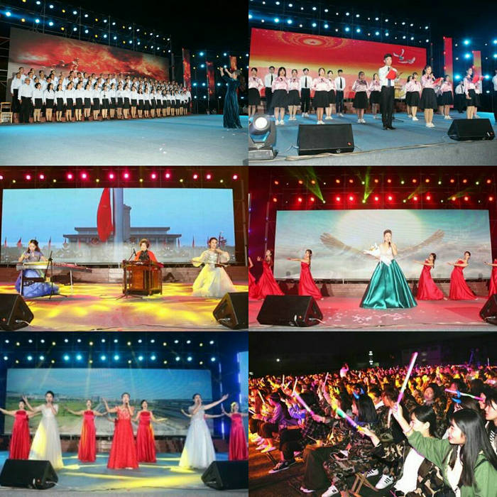晚会在教工小合唱《春天的故事》的优美歌声中拉开帷幕。随后,同学们用一首诗朗诵《中国路》,满怀豪情的抒发了对改革开放之路的赞美和对中国特色社会主义道路的坚定自信,济宁学院音乐系马昭艳、郝晓虹、蒋亚丽、黄鑫鑫、刘德宏老师应邀演奏的《我的祖国》,赢得了大家热烈的掌声,师生经典诵读、器乐合奏《喜洋洋》、街舞表演《舞动青春》、古琴表演《沧海一声笑》、相声《儿时玩伴》、舞蹈《恋》、古装走秀《采薇》引起了观众的强烈轰动,杜薇老师演唱的《走进新时代》把晚会推向高潮。晚会在全体教工高亢有力、慷慨激昂的合唱《光荣与梦想》歌声中落下帷幕。