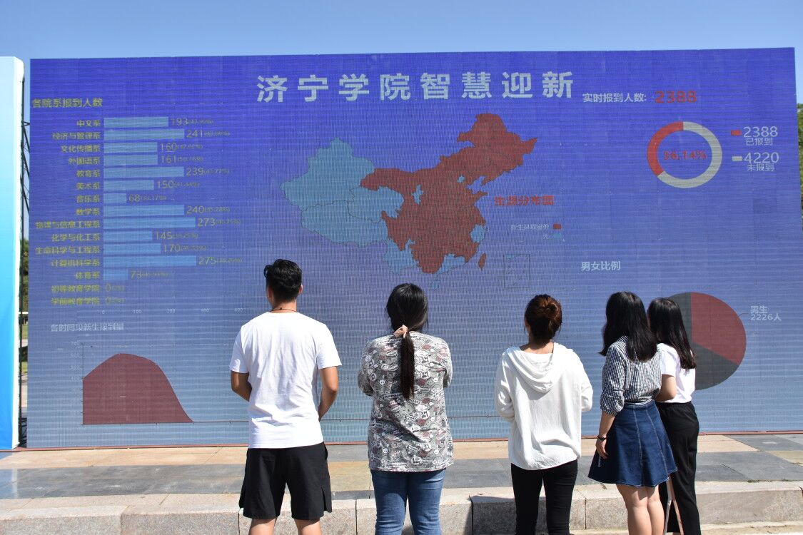 迎新数据大显示屏成为校园内一道靓丽的风景线。学校在图书馆南广场设立大型电子屏,实时显示新生报到情况。新生和家长一进学校大门,迎面就能看到大屏幕上的迎新数据,学校新生报到情况一目了然。