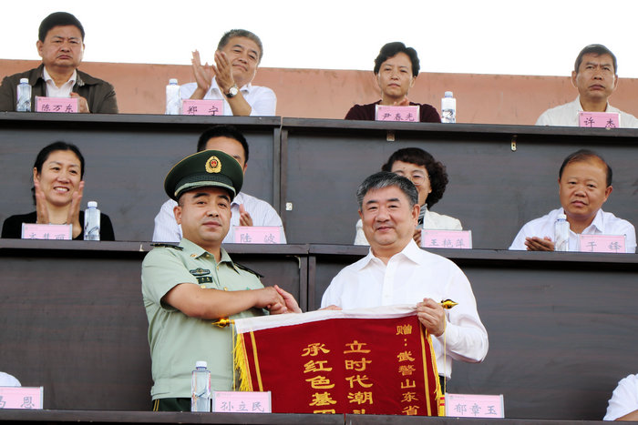 会上,郁章玉代表学校向武警济宁支队赠送了题有“立时代潮头展济宁武警风范 承红色基因铸圣城学子品格”字样的锦旗。