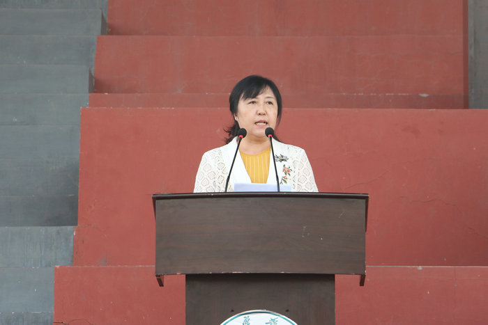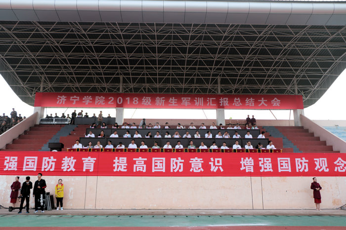 王旭英作总结讲话。她代表济宁学院向担任军训任务的武警山东省总队济宁支队承训官兵致以崇高的敬意!向圆满完成军训任务的2018级新同学表示热烈的祝贺!向坚守岗位、服务于2018级新生军训工作的辅导员、各职能部门工作人员的支持表示诚挚的感谢!她说,为期12天的军训中,参训人员牢牢把握训与练两个关键,承训教官严格施训,指导员协助有力,参训学员刻苦训练,圆满完成了各项军训任务;为期12天的军训,紧紧围绕军训,工作人员科学设置训练课目,精心安排军事理论课教学和业余活动,为军训开展提供了坚强保障。她认为,2018级新同学们交出了大学生成长第一课的合格答卷,拉开了大学生活的序幕。为此,她希望同学们继续保持在军训中形成的优良品格,积极践行“博学笃志、择善敦行”的校训,练就过硬本领,夯实成长成才的基础,努力成长为有社会责任、有创新精神、有专门知识、有实践能力、有健康身心的全面发展的人才;希望同学们继续发扬在军训中养成的优良作风,学会面对困难,勇于迎接挑战,坚定理想信念,不懈奋进,以新的姿态、新的付出、新的追求,书写人生新的篇章!