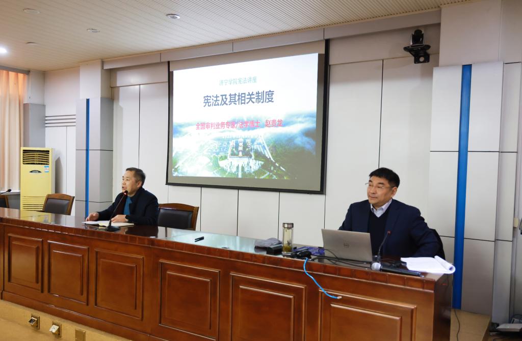 济宁市中级人民法院党组成员、副院长,全国审判业务专家,法学博士,山东大学法学院兼职教授、硕士生导师赵贵龙以《宪法及其相关制度》为题,从我国现行宪法法学渊源、现行宪法的传统文化基础、违宪审查制度的源起、国家监察制度的嬗变模式、公权与私权的法律案例等方面进行了系统而细致的讲解和阐述。