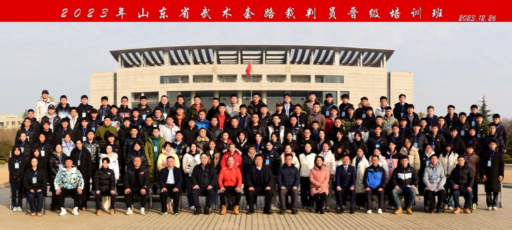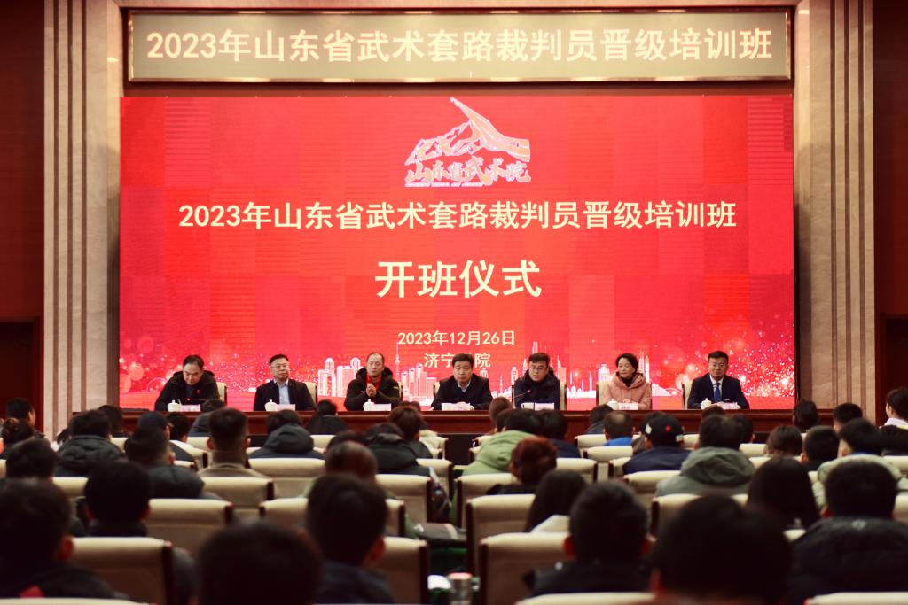 12月26日,2023年度山东省武术套路裁判晋级培训班在我校举行开班仪式。学校党委副书记、校长王清明,山东省武术院党总支书记、院长张祥府,济宁学院党委委员、副校长尹春光,北京体育大学中国武术学院、武术套路国家级裁判段永斌,我校体育学院、济宁市体育局相关负责人参加开班仪式,开班仪式由山东省武术院副院长张海洋主持,来自全省各市的120多名裁判员参加培训。