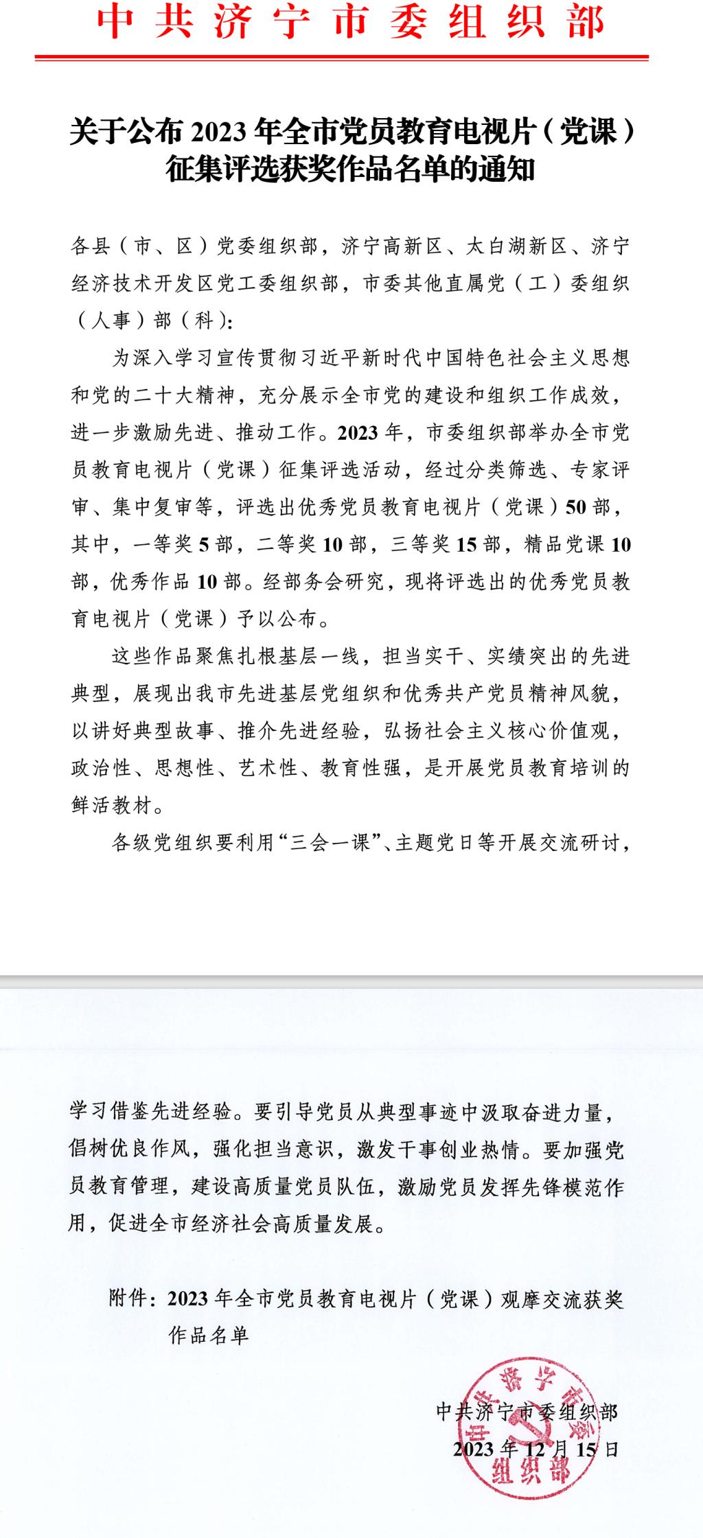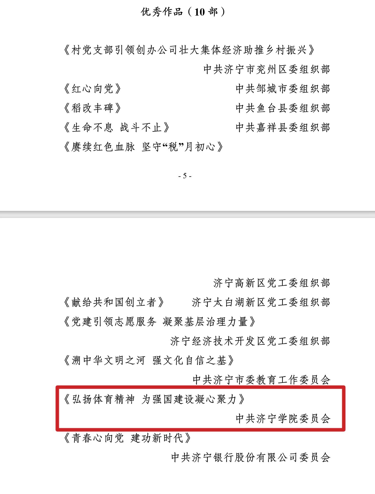 近日,2023年度济宁市党员教育电视片(党课)征集评选活动结果公布,我校推荐的作品:微党课《弘扬体育精神 为强国体育建设凝心聚力》荣获优秀作品。