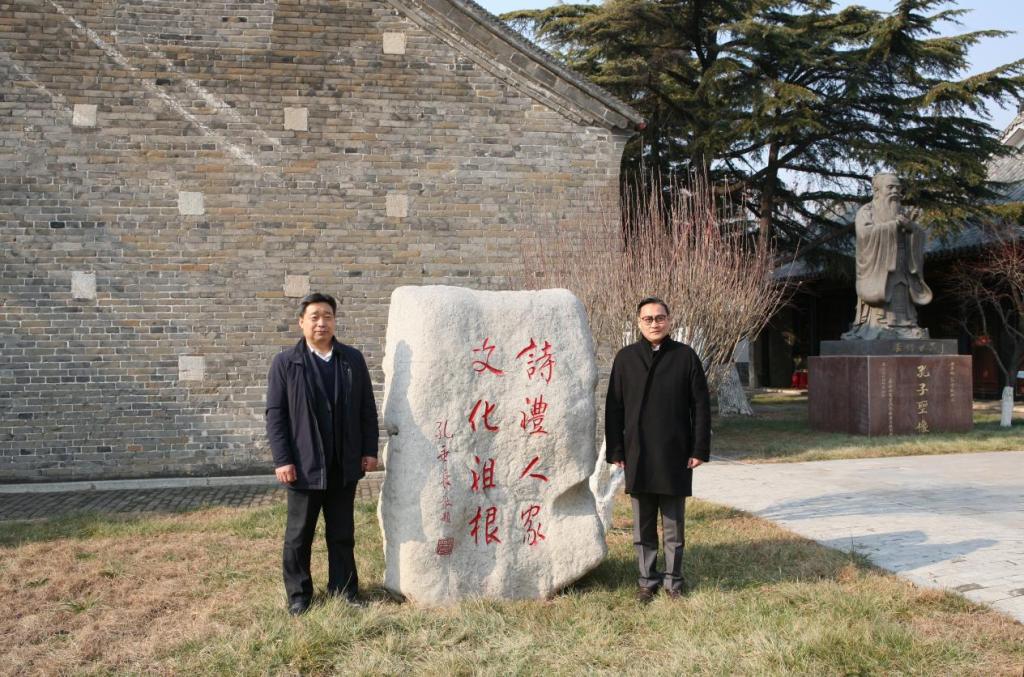 王清明与孔垂长先生在题词碑旁合影。