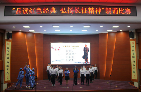 “红军不怕远征难,万水千山只等闲”来自全校各系的13支代表队经过精心编排和认真筹备,以声情并茂的朗诵表演,演绎了《长征颂》、《长征魂》、《我骄傲,我是中国人》、《青春中国》等篇目。各系代表队身着年代服装,将舞蹈、情景剧、书法创作、武术表演等多种艺术形式融入朗诵之中,尽情表达对祖国的热爱和对红军先烈的缅怀。他们或挥舞红旗,或高唱红歌,慷慨激昂,铿锵有力。青春的热情和力量感染了现场每一位观众,传递出青年一代听党话、跟党走的坚定信念。经过紧张激烈地角逐,教育系、音乐系和美术系荣获一等奖,中文系等5支代表队荣获二等奖,物理与信息工程系等5支代表队荣获三等奖。