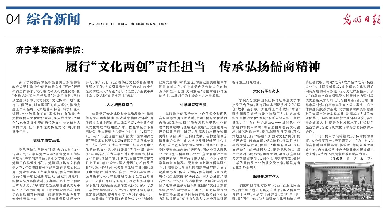 12月8日,《光明日报》刊发文章《济宁学院儒商学院:履行“文化两创”责任担当 传承弘扬儒商精神》。