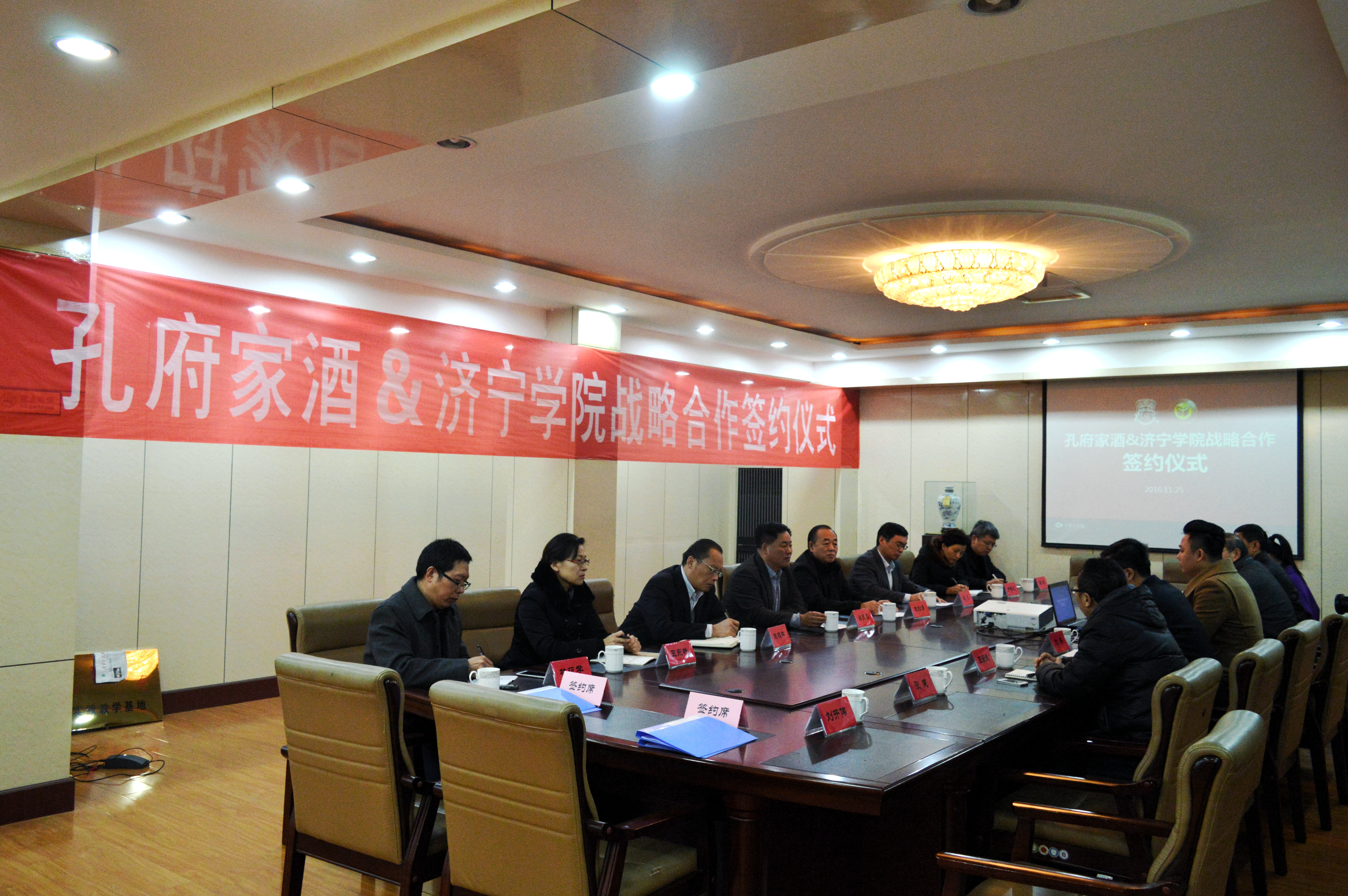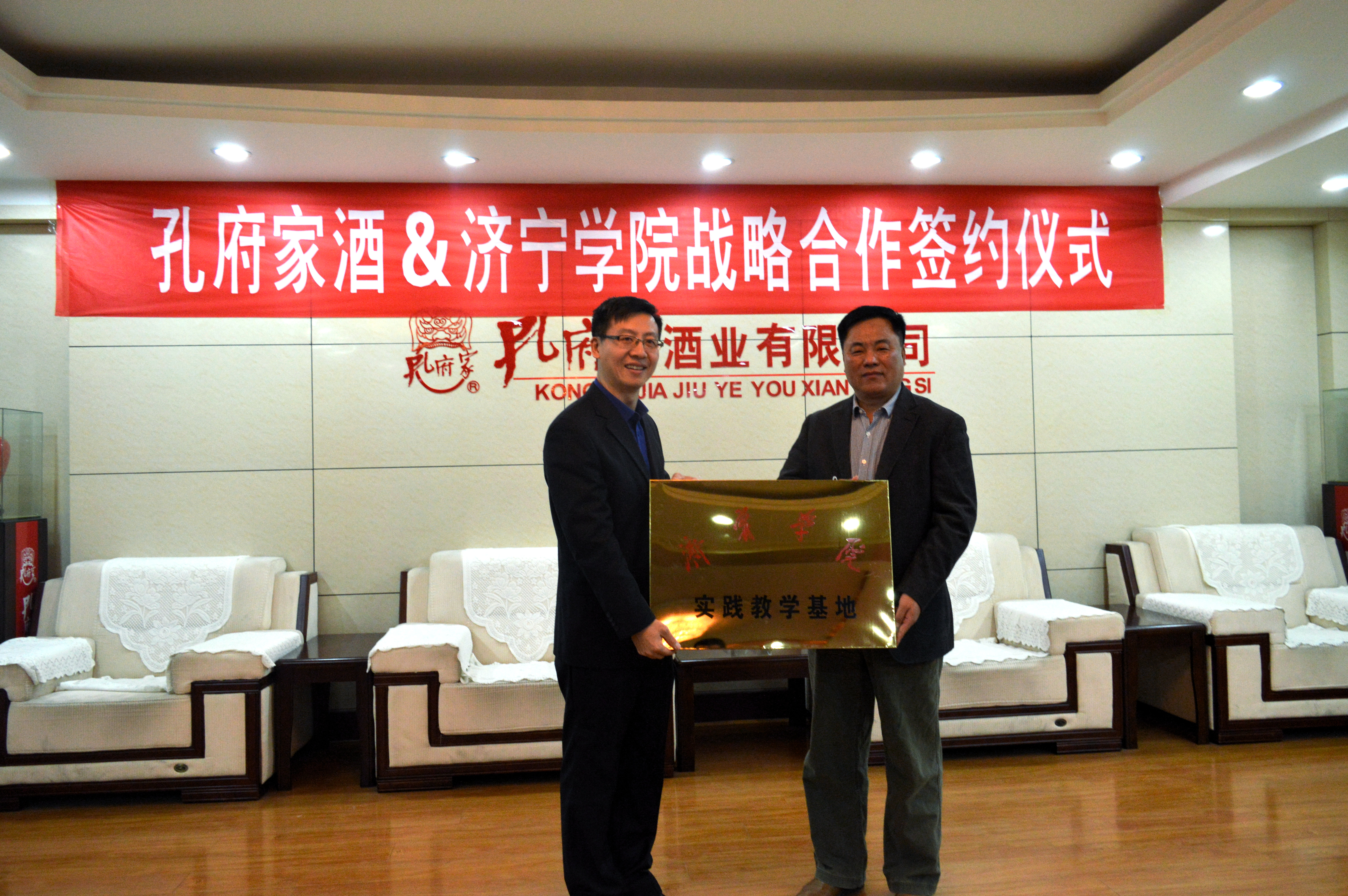 11月25日,济宁学院与孔府家酒业有限公司战略合作协议签字仪式在孔府家酒业有限公司隆重举行,学校党委副书记、校长吕灵昌,党委委员、副院长朱松涛,孔府家酒业总经理刘涛、市场总监左清河、酿酒总经理王爱民出席签约仪式,学校发展规划处、教务处、招生与就业指导处、生命科学与工程系、酿酒专业负责人,孔府家酒业酿酒大师魏金宝、国家级品酒师张洪奇参加仪式。吕灵昌、刘涛分别讲话,吕灵昌与刘涛代表双方签署了战略合作协议,并举行了“济宁学院实践教学基地”授牌仪式。