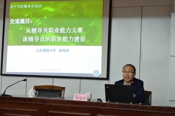 赵海涛介绍了山东省辅导员职业培训基地的发展情况和取得的成绩。重点讲解了两个方面问题。一是介绍了全国及山东省辅导员职业能力大赛的发展历史和大赛现状,并对全国和山东省辅导员职业能力大赛赛程赛制进行了详细分析,传授了比赛各环节中的学习重点和应试技巧。二是解读了关于高校辅导员职业能力建设的10个问题:如何提升自我思想政治素质的能力;开展学生思想政治教育的能力;处理学生突发事件的能力;用法律思维做好学生工作的能力;指导党团组织、学生班级建设的能力;培养学生干部的能力;熟练掌握学生情况的能力;善抓特殊群体学生的能力;重视学风建设、学业指导能力;指导学生职业生涯规划的能力。