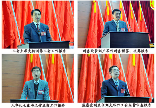 史仍洲作了题为《凝心聚力,奋发进取,团结动员教职工为学校全面推进深化改革贡献力量》的工会工作报告;刘广军作了《学校2015年财务决算和2016年财务预算报告》;张书义作了《四届一次“双代会”代表提案和建议落实情况的答复及四届二次“双代会”提案征集情况的报告》;刘克非作了《学校工会2015年度经费收支情况审查报告》。