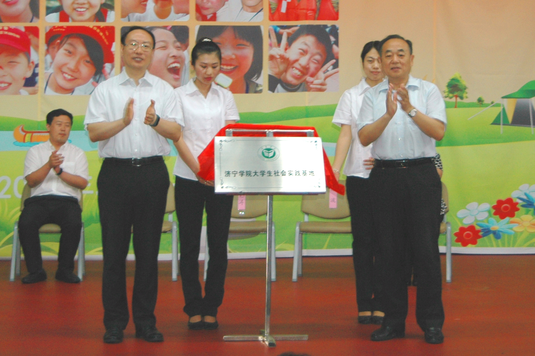 仪式上,团省委书记张涛与副院长朱松涛一起为“济宁学院大学生社会实践基地”揭牌。