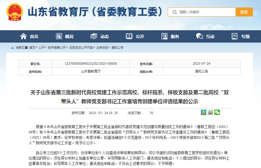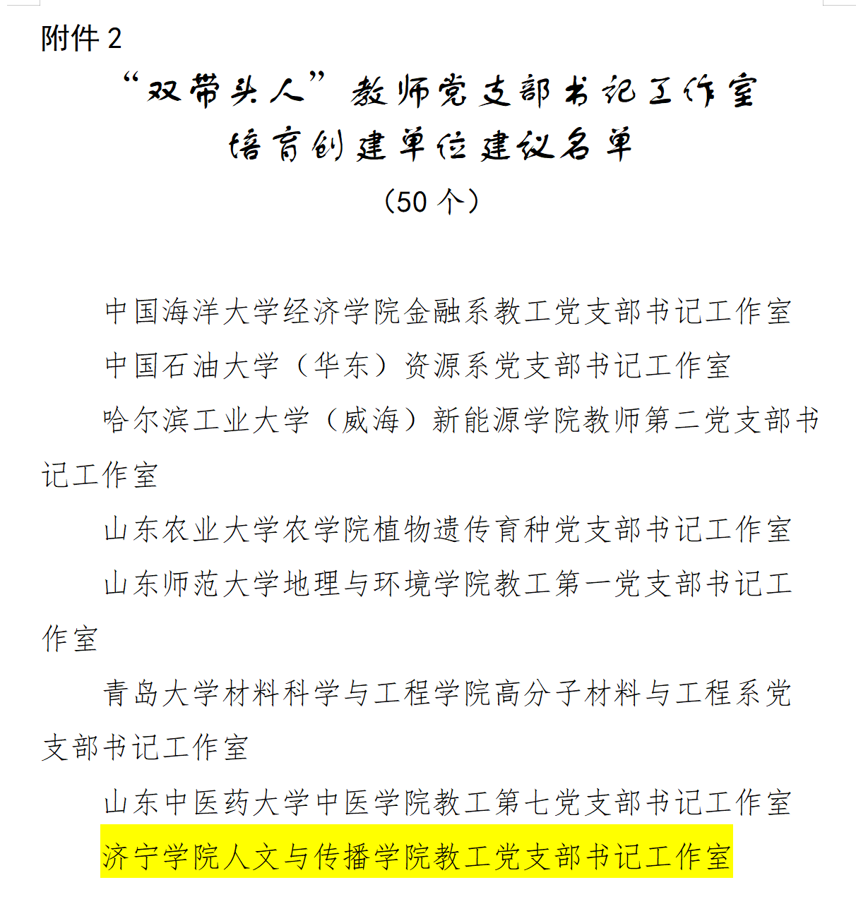 近日,山东省第二批高校“双带头人”教师党支部书记工作室培育创建单位评选结果公布。此次共遴选确定50个“双带头人”工作室,人文与传播学院教工党支部书记工作室名列其中。