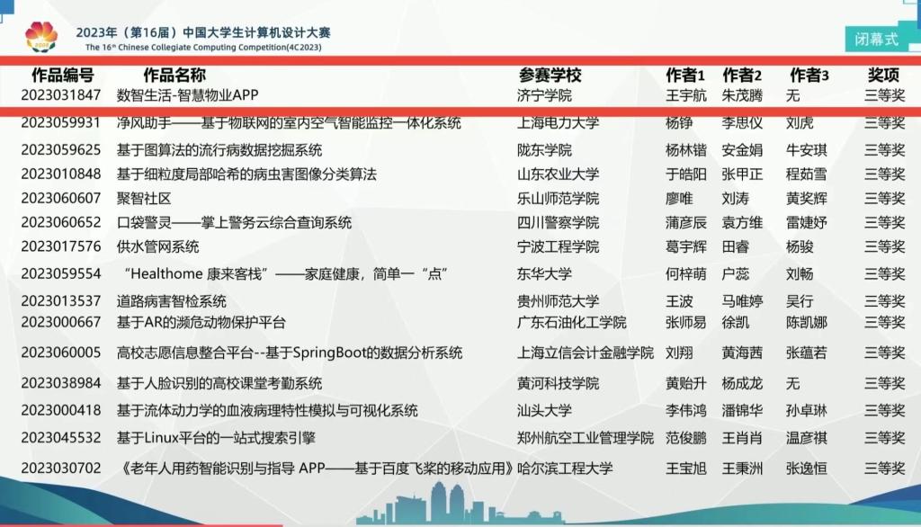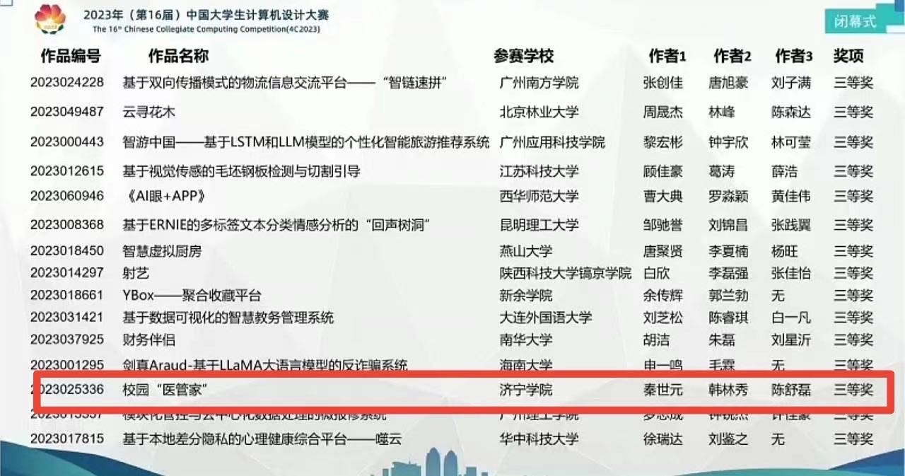7月23日—25日,第16届中国大学生计算机设计大赛(济南决赛区)“软件应用与开发”赛道在山东工商学院举办,来自全国568所高校,1084支代表队伍在为期3天的比赛日程中展开了激烈角逐。经过校赛、省赛层层选拔推荐,我校数学与计算机应用技术学院的2支队伍参加了此赛道的比拼,这也是我校学子第一次参加该类赛事。7月25日下午,大赛召开闭幕式并宣读了获奖名单,王宇航、朱茂腾团队的“数智生活-智慧物业APP”和秦世元、韩林秀、陈舒磊团队的“校园医管家”2个作品均获得全国三等奖。