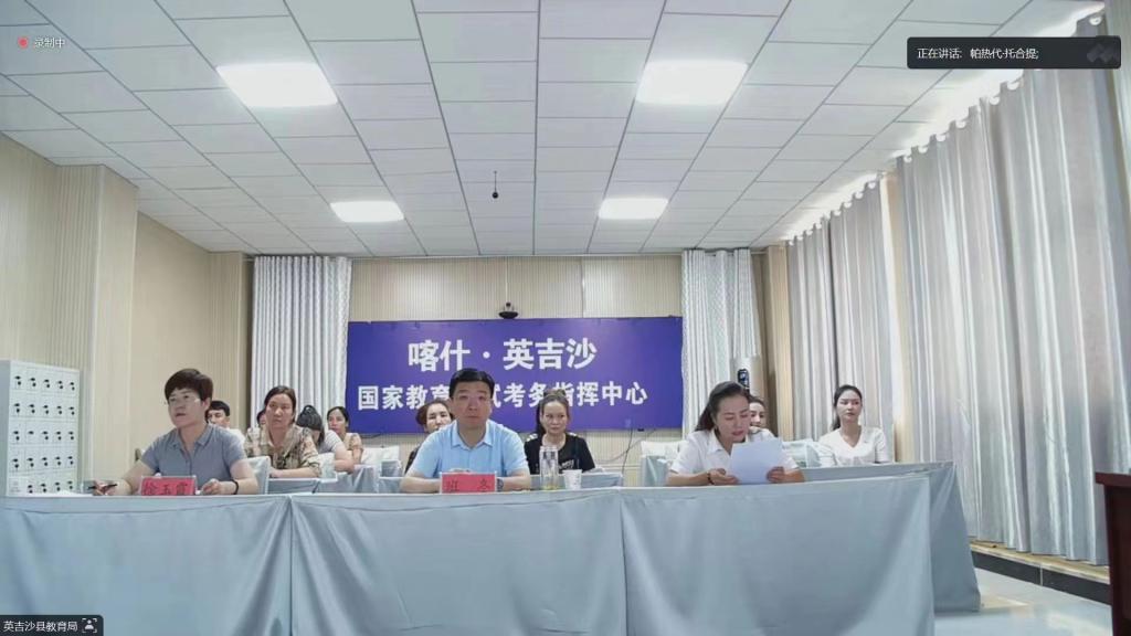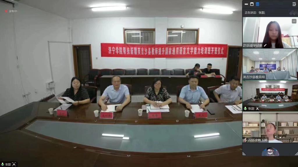 7月21日,济宁学院帮扶英吉沙县教师提升国家通用语言文字能力培训班开班仪式通过线上会议形式举行。济宁援疆指挥部文化润疆组组长、英吉沙县教育局党组成员、副局长、四级调研员班冬,英吉沙县教育局语言文字办主任徐玉霞,我校团委书记张静、教务处副处长陈龙、人文与传播学院党委书记朱桂林、副书记岳现超,以及我校大学生志愿者代表、英吉沙县学员代表参加开班仪式。