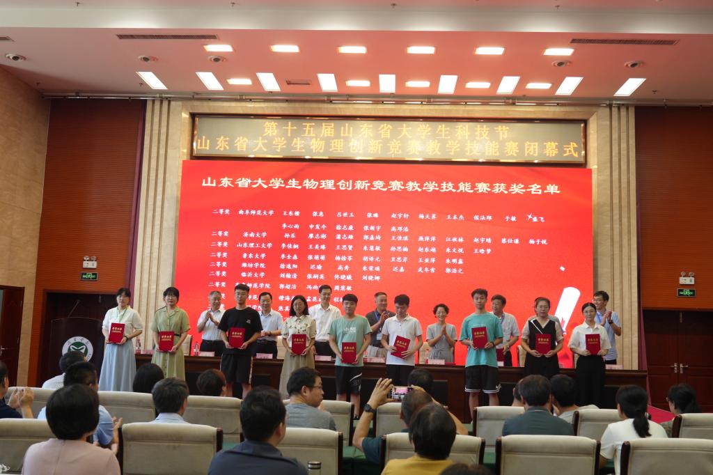 7月16日上午,在学校科技文化大楼学术报告厅举行了大赛闭幕式。校党委委员、副校长尹春光,校党委委员、副校长赵明,山东物理学会副理事长兼秘书长、山东大学教授张承琚,山东物理学会常务理事、山东科技大学教授张鲁殷,山东物理学会常务理事、大赛委员会主任、曲阜师范大学教授胡象岭,山东省特级教师、齐鲁名师、中小学正高级教师孔祥龙,鲁东大学物理与光电工程学院副院长赵文凯,竞赛组委会专家,物理科学与智能工程学院相关人员,各参赛高校教师及学生参加。闭幕式由赵明主持。