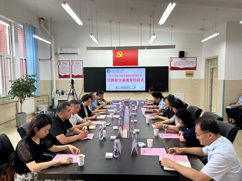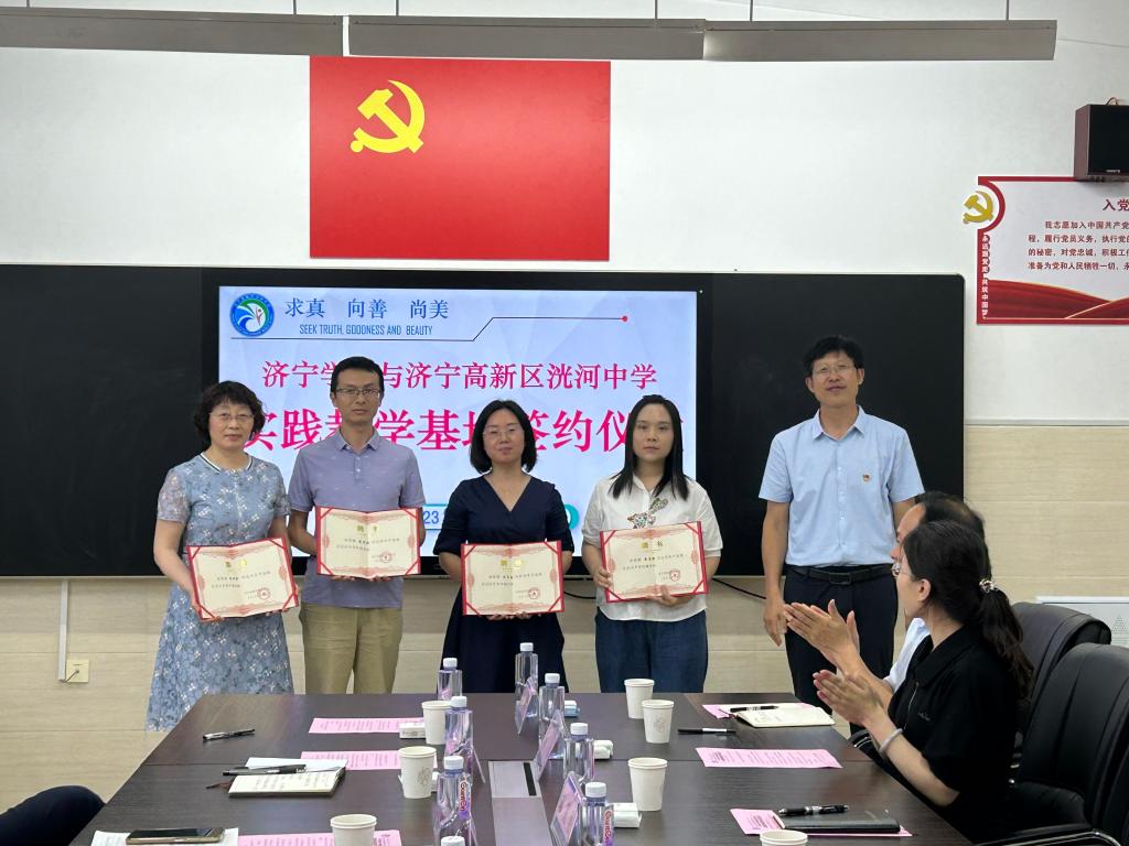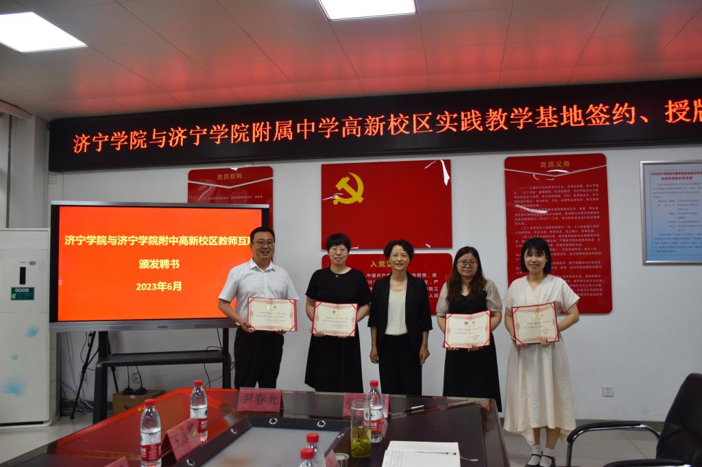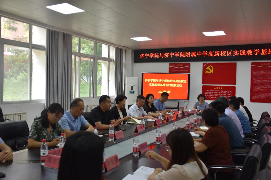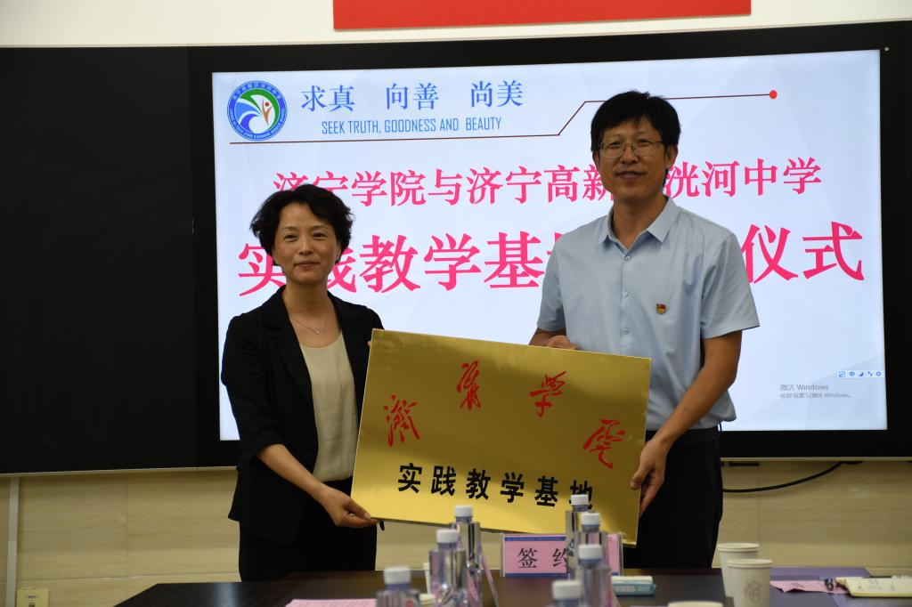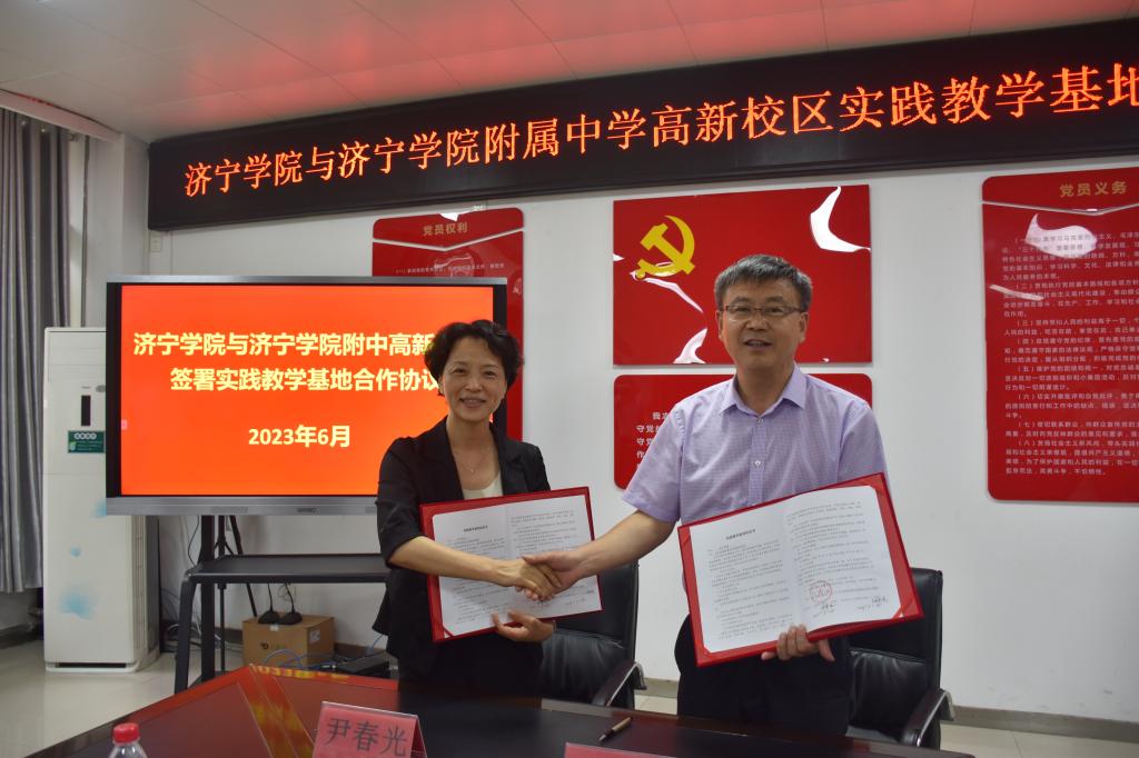 6月28日下午,我校与济宁学院附属中学高新区校区、济宁高新区洸河中学举行实践教学基地签约授牌仪式。校党委委员、副校长尹春光、济宁高新区发展软环境保障局局长李翠玲、济宁学院附属中学高新校区校长张新宽,济宁高新区洸河中学校长胡克亮出席签约活动。我校数学与计算机应用技术学院、人文与传播学院负责同志及教师代表参加了活动。
