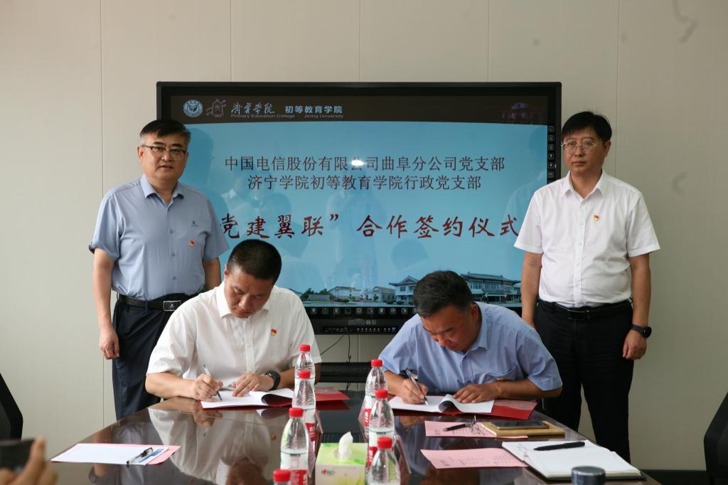 全面贯彻落实党的二十大精神,推进学习贯彻习近平新时代中国特色社会主义思想主题教育深入开展,6月28日上午,我校初等教育学院行政党支部和中国电信股份有限公司曲阜分公司党支部举行了“党建翼联”共建签约仪式。出席仪式的有学校党委副书记丰家雷,中国电信曲阜分公司党支部书记徐称意及总支党员代表,初等教育学院班子成员、行政党支部党员,仪式由学院党委书记刘亚斌主持。