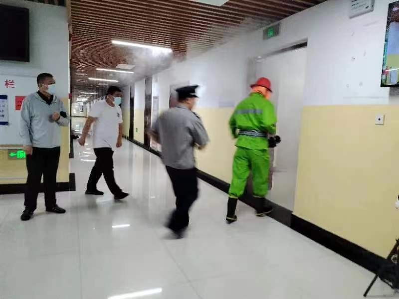 防火疏散演练以新7号公寓843房间发生着火为例,给师生演示了消防控制室值班员现场核实火情、启动火灾应急疏散预案、组织疏散和初起火灾扑救等环节。