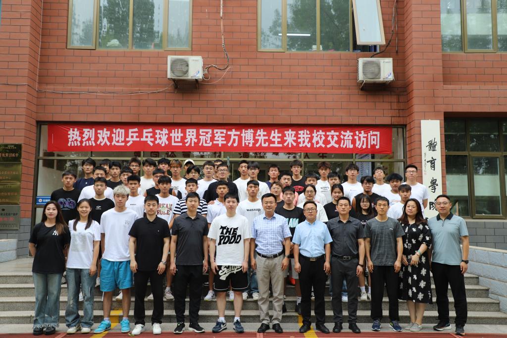 杨天梅对方博一行的到来表示欢迎,并介绍了学校的办学情况。他谈到,乒乓球作为我国“国球”,是普及程度最高、最喜闻乐见的群众体育项目。我校自2021年起招收体育教育(校企合作、乒乓球方向)专业学生,是高校学科建设、人才培养与乒乓球运动进一步推广、普及相融合的突破尝试。作为世界冠军和中国乒协全民健身推广大使,方博先生此次到访,必将助力我校体育人才培养,拓宽体育专业学生就业渠道。
