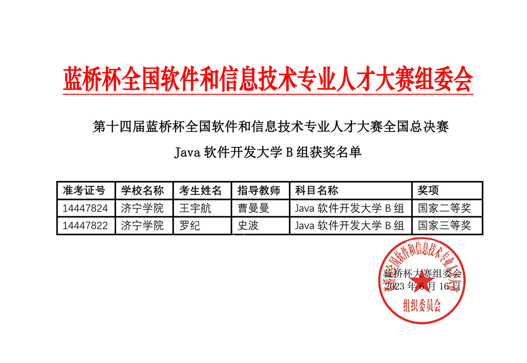 6月10日第14届“蓝桥杯”大赛全国总决赛在全国50个赛点举办,数学与计算机应用技术学院的4名省级一等奖获得者在齐鲁工业大学赛点参加了Java软件开发B组的竞赛科目的比拼。6月16日“蓝桥杯”大赛全国总决赛成绩公布,王宇航同学获得全国二等奖,罗纪同学获得全国三等奖,王旭、郭晨旭同学获得全国优秀奖。这是我校学子参加“蓝桥杯”大赛(软件类)以来第一次获得国家奖项,实现了国赛获奖零的突破!