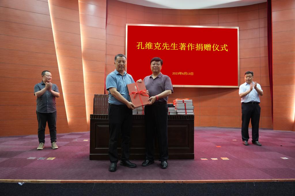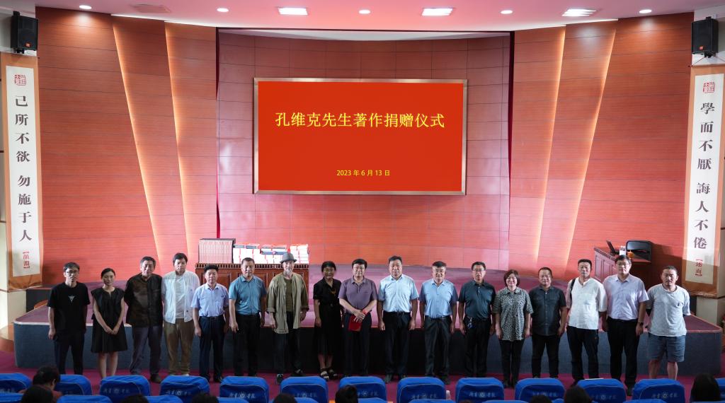 孔维克此次为母校捐赠个人画集19册,及其主持主编十三卷本大型文化工程系列研究丛书《齐鲁画风大系——山东中国画》等各种展览画集共70多册,是其多年心血的凝聚,是他成长、成才和奋斗历程的真实记录,是他馈赠母校的知识财富和艺术大礼,包含着他对母校的深情厚谊,体现了他不忘母校、感恩母校、回报母校的赤子丹心。