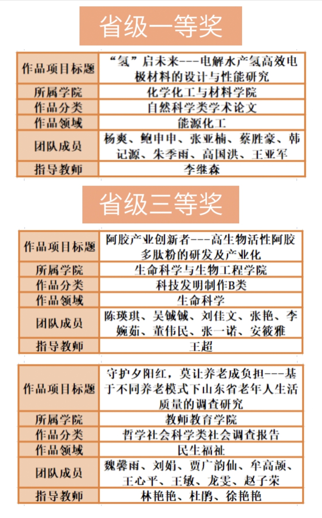 本届竞赛分自然科学类学术论文、科技发明制作、哲学社会科学类社会调查报告三个类别,设初赛、复赛、决赛三个阶段。全省141所高校、18万名青年学子参加,经过层层评审,共有195件作品进入终审决赛。我校化学化工与材料学院李继森老师指导的《“氢”启未来---电解水产氢高效电极材料的设计与性能研究》作品闯入终审决赛,经过现场质询、问辨评审等环节的激烈角逐,最终荣获一等奖。此外,生命科学与生物工程学院王超老师指导的《阿胶产业创新者---高生物活性阿胶多肽粉的研发及产业化》、教师教育学院林艳艳、杜鹃、徐艳艳老师指导的《守护夕阳红,莫让养老成负担---基于不同养老模式下山东省老年人生活质量的调查研究》获得省级三等奖。