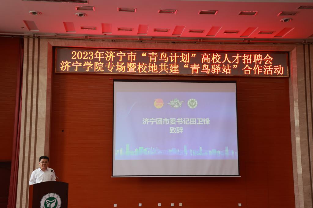 5月20日,由济宁团市委、济宁学院、济宁市人才工作领导小组办公室联合主办的2023年济宁市“青鸟计划”高校人才招聘会济宁学院专场暨校地共建“青鸟驿站”合作活动在济宁学院成功举行。济宁学院党委委员、副院长赵明、济宁团市委书记田卫锋出席会议并致辞,共同为“青鸟驿站”揭牌。