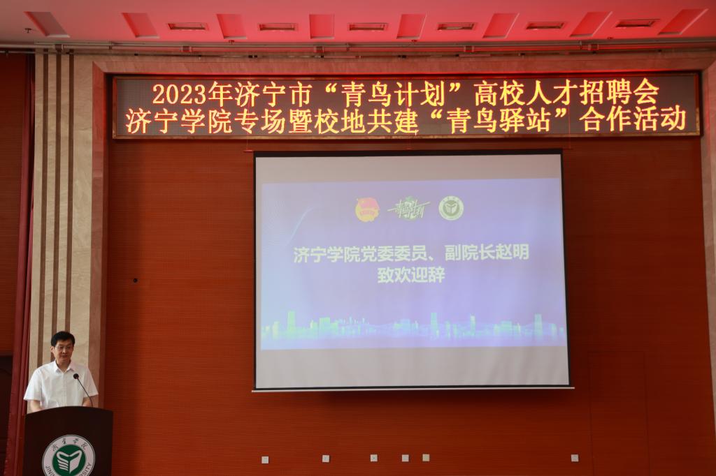 校党委委员、副院长赵明致欢迎辞,他首先介绍了学校事业发展情况,并表示,本次“青鸟计划”济宁学院专场招聘会及共建“青鸟驿站”活动,开启了“政校企”三方联动促就业的新篇章,对于打好稳就业攻坚战,搭建用人单位和毕业生双向选择平台,促进毕业生更加充分和高质量精准就业,具有重要意义。他强调,学校将以此项合作活动为契机,全力做好招聘会的各项服务工作,进一步拓展推动校地企三方在促进大学生就业实习、创新人才培养、产学研项目建设、科技成果转化等工作方面的合作空间,塑造发展新动能新优势,助力济宁经济社会发展做出新作为新贡献。