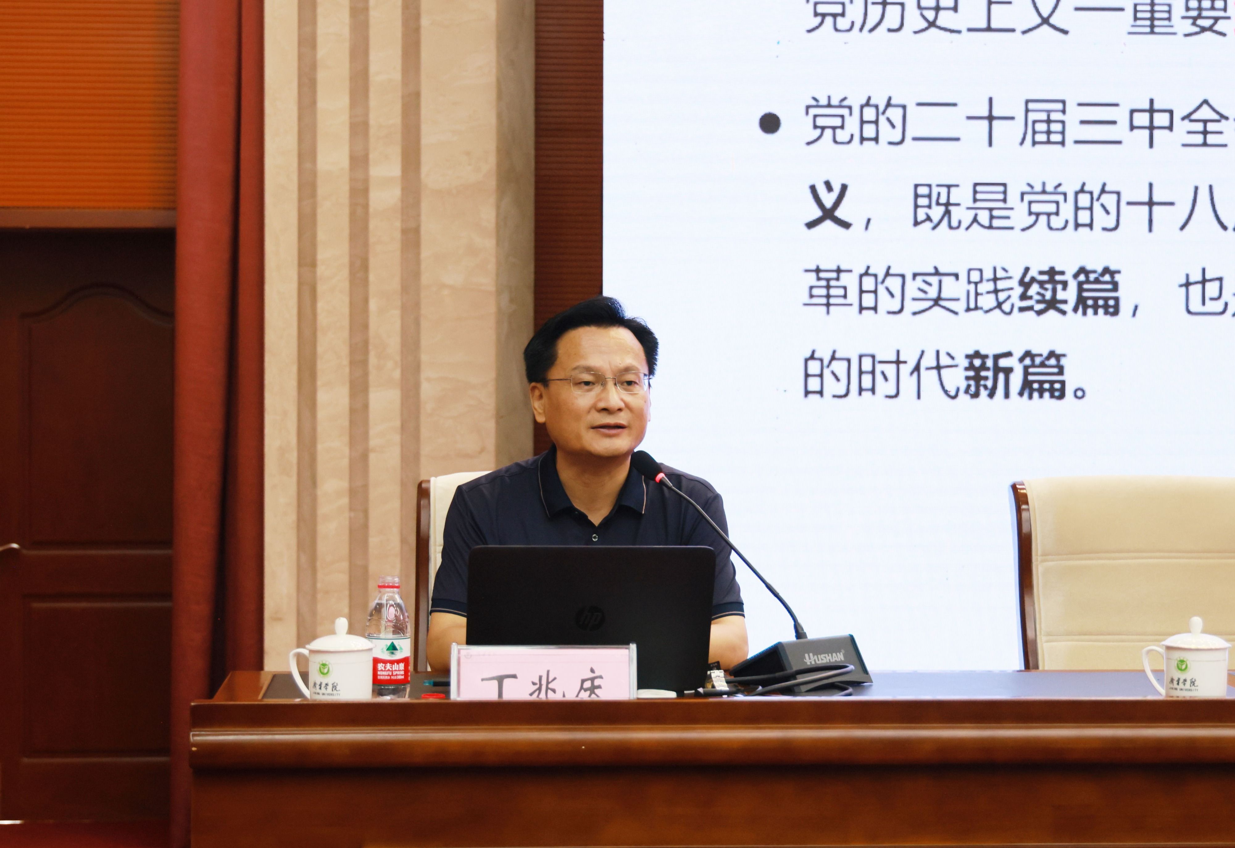 报告会上,丁兆庆重点围绕《中共中央关于进一步全面深化改革、推进中国式现代化的决定》,从深刻领会进一步全面深化改革的重大意义、目标要求、部署举措、根本保证等方面,结合当前国际国内政治经济形势分析,全面系统地解读了党的二十届三中全会精神。辅导报告视野开阔、内容丰富、深入浅出、分析透彻,既有政治上的高度,又有理论上的深度,对与会同志进一步全面学习、全面把握、全面落实党的二十届三中全会精神,深入推进学校教育教学综合改革和高质量发展作了很好的辅导。