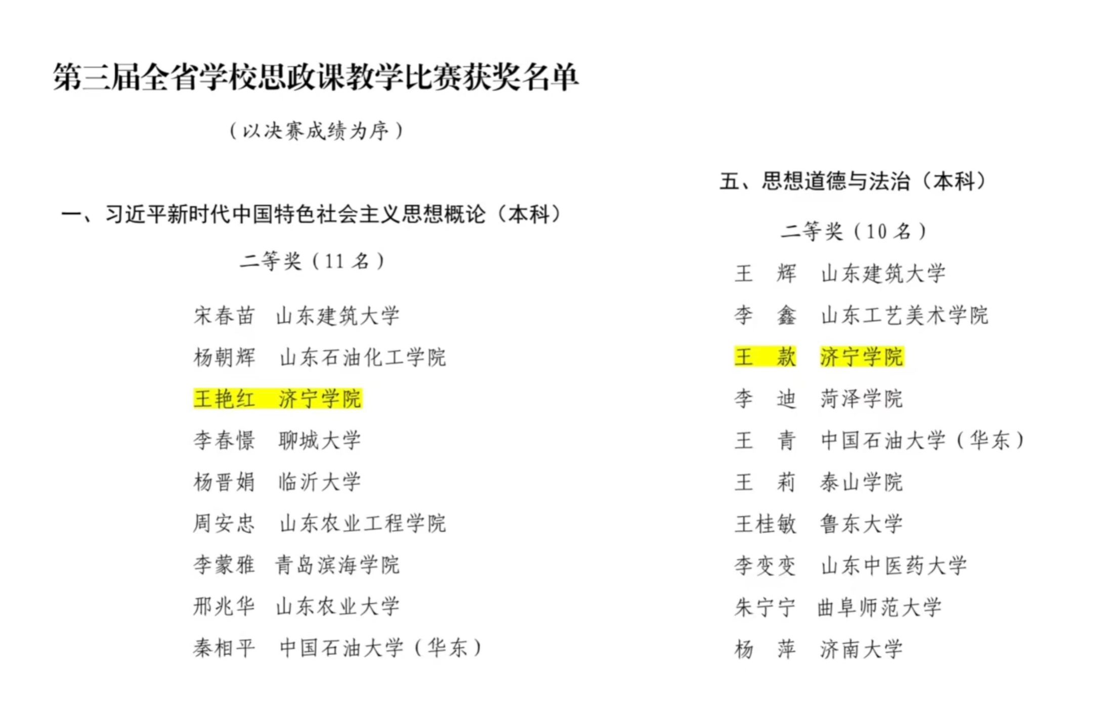 近日,山东省教育厅公布了第三届全省学校思想政治理论课教学比赛获奖人员名单,我校马克思主义学院教师王艳红荣获《习近平新时代中国特色社会主义思想概论》本科组二等奖,王款荣获《思想道德与法治》本科组二等奖。