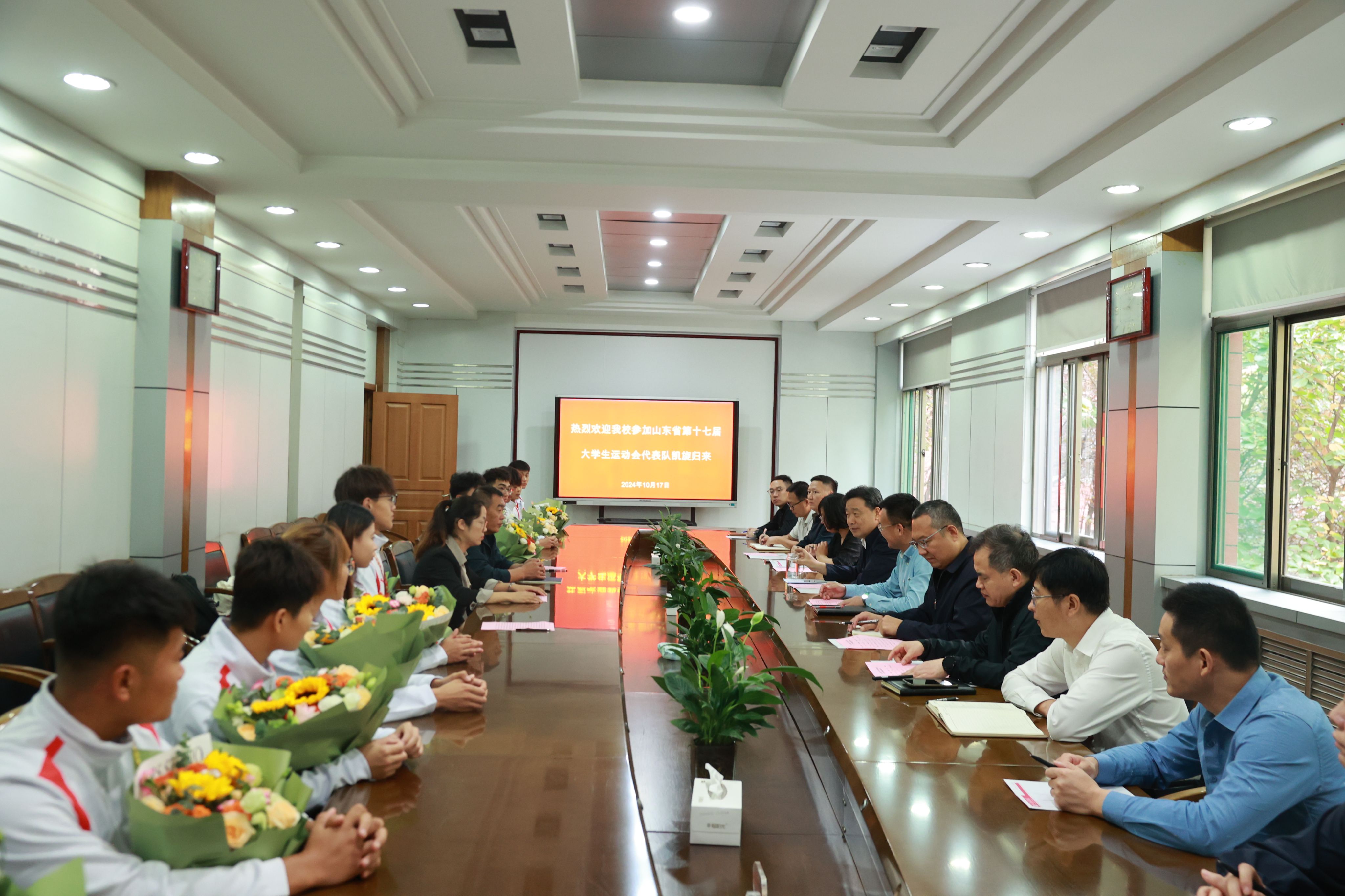 10月17日上午,我校参加山东省第十七届大学生运动会代表队欢迎仪式在行政楼A221会议室举行。校党委副书记、校长王清明出席并讲话。党委宣传部、学生工作处、教务处、团委、体育学院相关负责同志及全体教练员、运动员参加。仪式由体育学院院长徐刚主持。