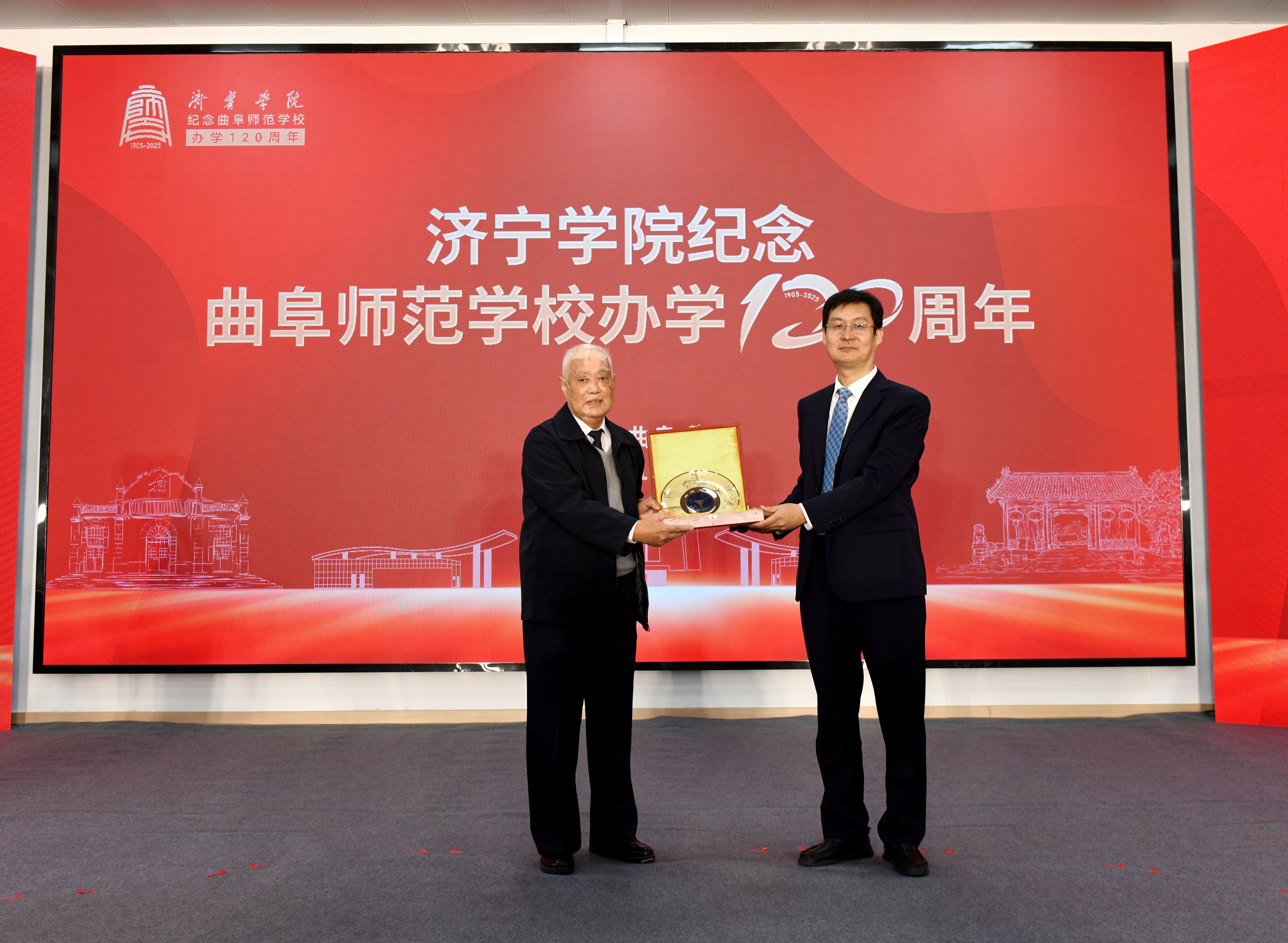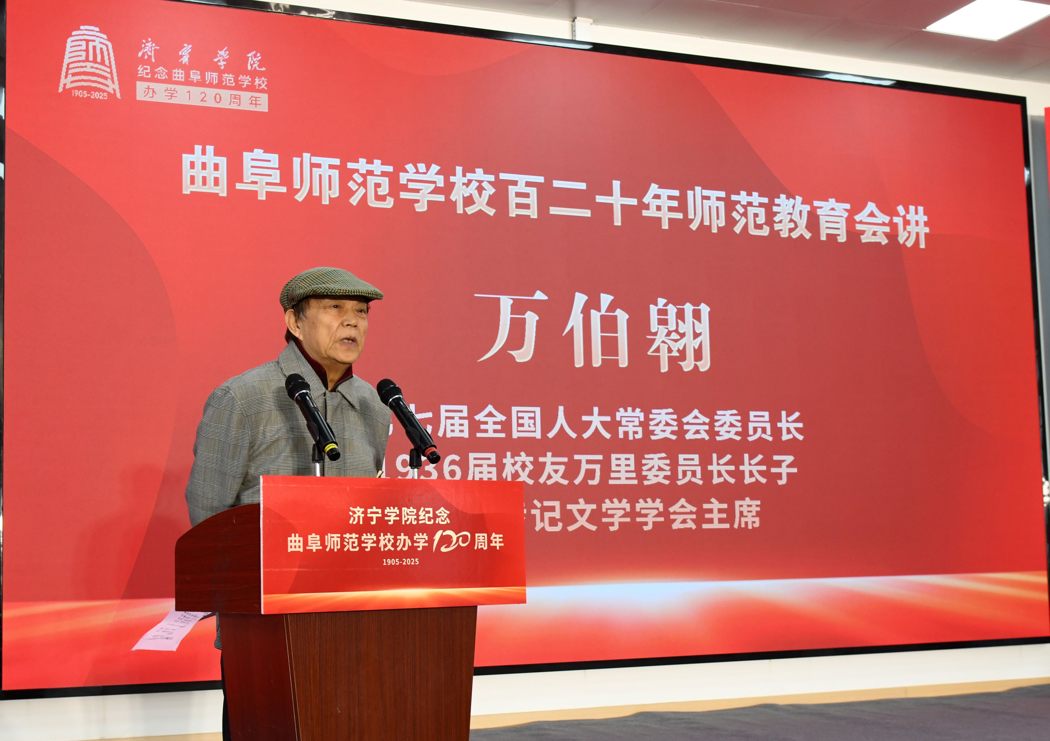 万伯翱致辞并向学校赠送礼品。他深情回忆了父亲万里与曲阜师范学校的深厚渊源,并高度赞扬了学校120年来在师范教育领域所取得的辉煌成就。他希望学校能够继续发扬优良传统,培养出更多德才兼备的优秀教师,为我国的教育事业添砖加瓦。希望新时代的青年学子,在济宁学院这片承载着百年师范传统的沃土上,继续发扬“学而不厌,诲人不倦”的精神,把个人理想融入国家发展,把知识转化为建设祖国的本领。