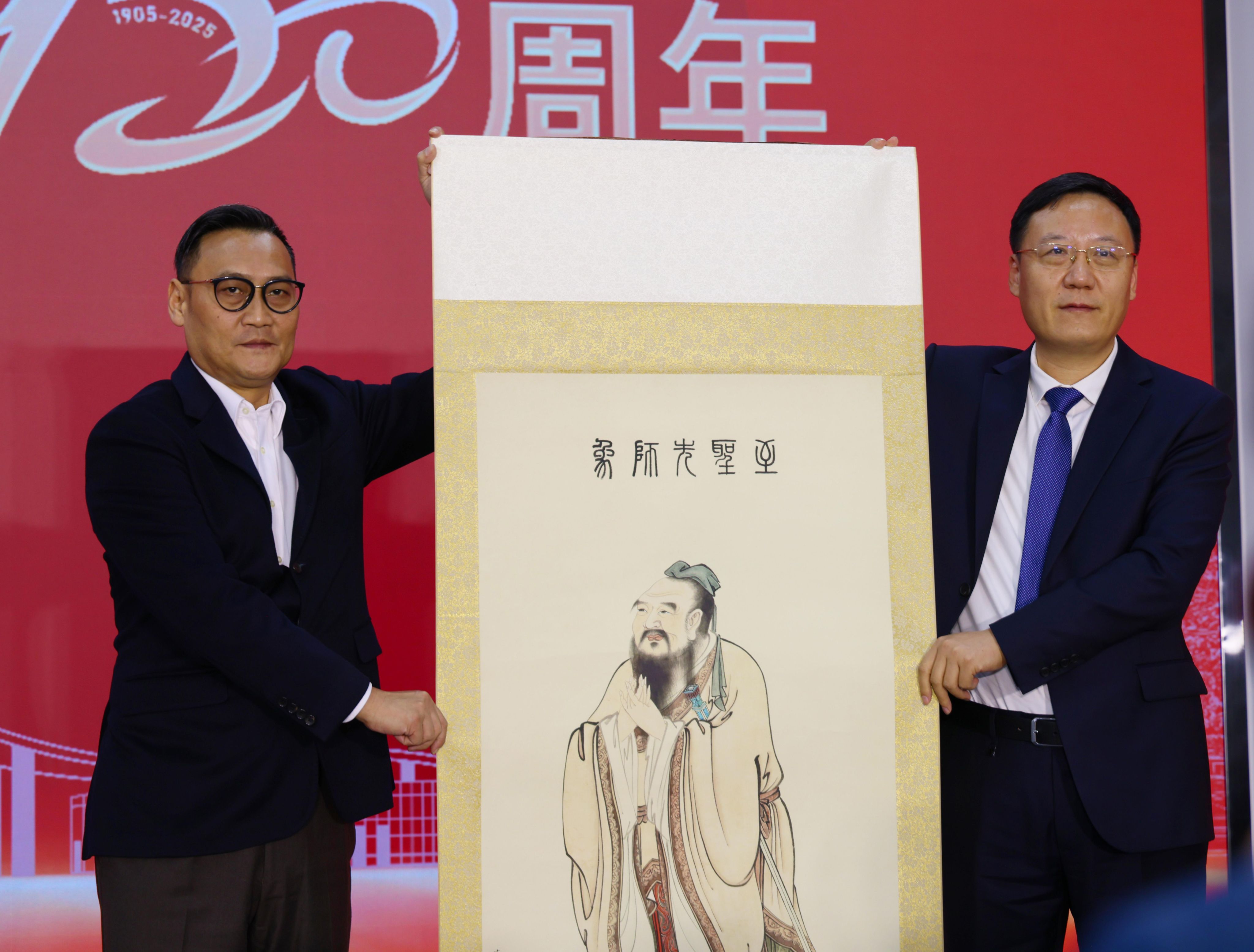 孔垂长致辞并向学校赠送礼品。他指出,曲阜作为儒家文化发源地,曲阜师范学校120年的办学历史不仅是对教育事业的坚守,更是对中华优秀传统文化的传承与弘扬。他希望,学校继续坚守“斯文在兹”的信念,让儒家“修身齐家”的家风融入师德建设,让“仁者爱人”的情怀成为师者底色,让“天下为公”的担当成为学子追求,深入挖掘和传承中华优秀传统文化,培养出更多具有深厚文化底蕴和家国情怀的优秀人才。